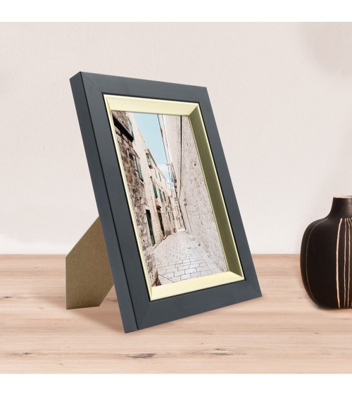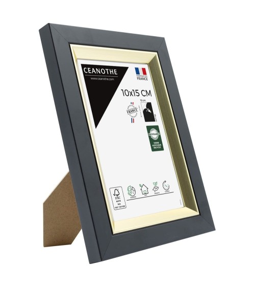 Protégez et mettez en avant toutes vos photos grâce au cadre Noir Actual et son verre acrylique recyclé. Ce cadre photo format 10x15 cm est idéal pour mettre en avant des photos, posters ou affiches grand format de 10x15 cm. Ajoutez un passe-partout pour protéger et mettre en avant dautres formats de photos et posters avec ce cadre.La couleur Noir et Doré de ce cadre est tendance et indémodable. Elle fait ressortir toutes vos plus belles uvres et photos tout en apportant une touche luxe et élégant à votre intérieur. Cadre Home déco facile à accrocher, il trouvera naturellement sa place dans toutes les pièces de la maison : hall dentrée, salon, chambres à coucher. Le cadre sublimera facilement un grand nombre de photos avec une touche déco très tendance, tout en raffinement.Ce cadre photo Noir Doré 10x15 cm est en résine recyclée, un matériau solide, nature et esthétique. Ses dimensions extérieures sont 197x147x19 mm et se compose de 4 baguettes travaillées avec une finition de qualité. Il apportera de la profondeur à vos photos avec un rendu design très qualitatif. Les finitions de ce cadre sont soignées. La couleur de cette gamme Actual fait de ce cadre une valeur sûre que vous garderez longtemps.Fabriqués en France et dans le respect de lenvironnement, tous les cadres de la collection Actual sont confectionnés en résine recyclée. Parfait pour la décoration, il est léger et 100% recyclable.Depuis 1975, Ceanothe perfectionne au quotidien son savoir-faire et expertise sur lencadrement, la mise en valeur photographique et la décoration murale. Une société française engagée dans une démarche éco-responsable.