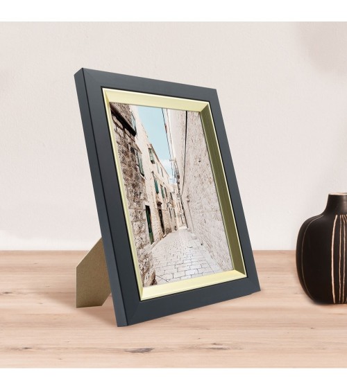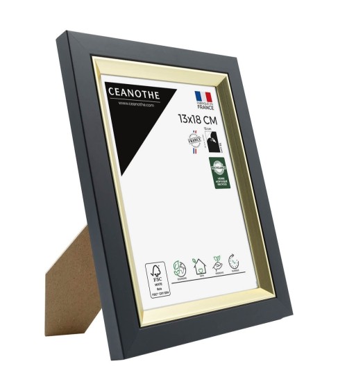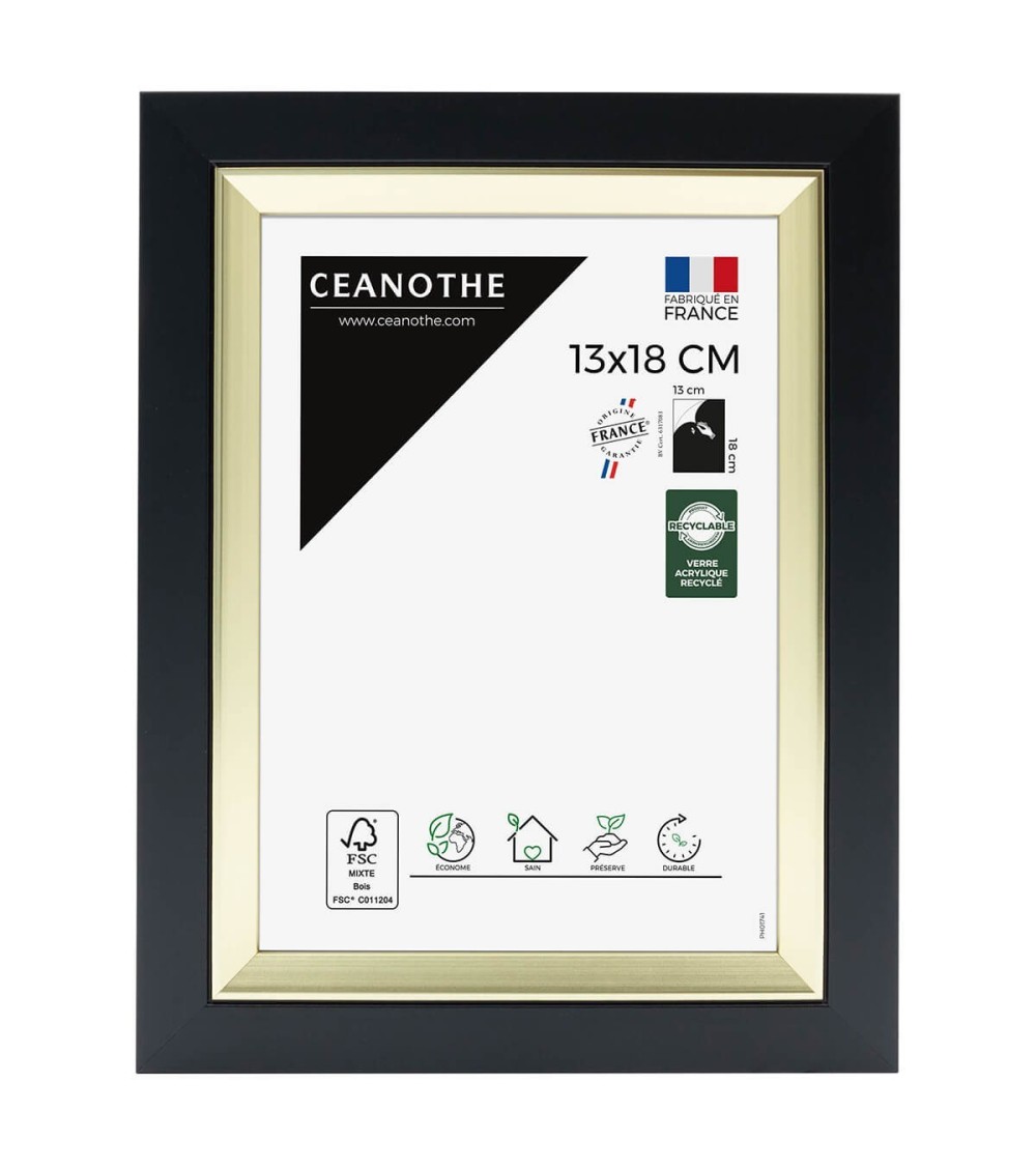 Protégez et mettez en avant toutes vos photos grâce au cadre Noir Actual et son verre acrylique recyclé. Ce cadre photo format 13x18 cm est idéal pour mettre en avant des photos, posters ou affiches grand format de 13x18 cm. Ajoutez un passe-partout pour protéger et mettre en avant dautres formats de photos et posters avec ce cadre.La couleur Noir et Doré de ce cadre est tendance et indémodable. Elle fait ressortir toutes vos plus belles uvres et photos tout en apportant une touche luxe et élégant à votre intérieur. Cadre Home déco facile à accrocher, il trouvera naturellement sa place dans toutes les pièces de la maison : hall dentrée, salon, chambres à coucher. Le cadre sublimera facilement un grand nombre de photos avec une touche déco très tendance, tout en raffinement.Ce cadre photo Noir Doré 13x18 cm est en résine recyclée, un matériau solide, nature et esthétique. Ses dimensions extérieures sont 227x177x16 mm et se compose de 4 baguettes travaillées avec une finition de qualité. Il apportera de la profondeur à vos photos avec un rendu design très qualitatif. Les finitions de ce cadre sont soignées. La couleur de cette gamme Actual fait de ce cadre une valeur sûre que vous garderez longtemps.Fabriqués en France et dans le respect de lenvironnement, tous les cadres de la collection Actual sont confectionnés en résine recyclée. Parfait pour la décoration, il est léger et 100% recyclable.Depuis 1975, Ceanothe perfectionne au quotidien son savoir-faire et expertise sur lencadrement, la mise en valeur photographique et la décoration murale. Une société française engagée dans une démarche éco-responsable.
