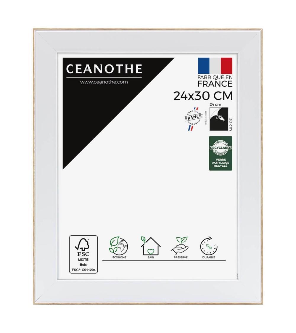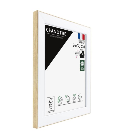 Protégez et mettez en avant toutes vos photos grâce au cadre Bois brut Newton et son verre acrylique recyclé. Ce cadre photo format 24x30 cm est idéal pour mettre en avant des photos, posters, affiches ou carte postale. Ajoutez un passe-partout pour protéger et sublimer dautres formats photos. La gamme propose différentes tailles et couleurs. La couleur blanche et contour Bois brut de ce cadre est simple, moderne et indémodable. Elle fait ressortir toutes vos plus belles uvres et photos. Cadre Home déco facile à accrocher, il trouvera naturellement sa place dans toutes les pièces de la maison : hall dentrée, salon, chambres. Le cadre sublimera facilement un grand nombre de photos avec une touche déco contemporaine et tendance. Ce cadre photo 24x30 cm est en résine recyclée, un matériau solide, léger et esthétique. Ses dimensions extérieures sont 350x290x22 mm et se compose de 4 baguettes de qualité. Il apportera de la profondeur à vos photos avec un rendu design, moderne et très qualitatif. Ce cadre apporte une jolie touche décoration industrielle. Les finitions de ce cadre sont soignées. Le style simple et tendance de cette gamme fait de ce cadre une valeur sûre que vous garderez longtemps.Fabriqués dans le respect de lenvironnement, tous les cadres design de la collection Newton sont confectionnés à partir de résine recyclée, léger et 100% recyclable, parfait pour la décoration. Depuis 1975, Ceanothe perfectionne au quotidien son savoir-faire et expertise sur lencadrement, la mise en valeur photographique et la décoration murale. Une société française engagée dans une démarche éco-responsable.