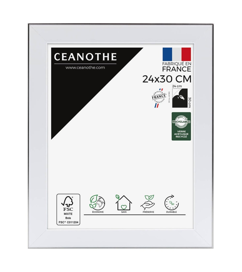 Protégez et mettez en avant toutes vos photos grâce au cadre Acier Newton et son verre acrylique recyclé. Ce cadre photo format 24x30 cm est idéal pour mettre en avant des photos, posters, affiches ou carte postale. Ajoutez un passe-partout pour protéger et sublimer dautres formats photos. La gamme propose différentes tailles et couleurs. La couleur blanche et contour Acier de ce cadre est simple, moderne et indémodable. Elle fait ressortir toutes vos plus belles uvres et photos. Cadre Home déco facile à accrocher, il trouvera naturellement sa place dans toutes les pièces de la maison : hall dentrée, salon, chambres. Le cadre sublimera facilement un grand nombre de photos avec une touche déco contemporaine et tendance. Ce cadre photo 24x30 cm est en résine recyclée, un matériau solide, léger et esthétique. Ses dimensions extérieures sont 350x290x22 mm et se compose de 4 baguettes de qualité. Il apportera de la profondeur à vos photos avec un rendu design, moderne et très qualitatif. Ce cadre apporte une jolie touche décoration industrielle. Les finitions de ce cadre sont soignées. Le style simple et tendance de cette gamme fait de ce cadre une valeur sûre que vous garderez longtemps.Fabriqués dans le respect de lenvironnement, tous les cadres design de la collection Newton sont confectionnés à partir de résine recyclée, léger et 100% recyclable, parfait pour la décoration. Depuis 1975, Ceanothe perfectionne au quotidien son savoir-faire et expertise sur lencadrement, la mise en valeur photographique et la décoration murale. Une société française engagée dans une démarche éco-responsable.
