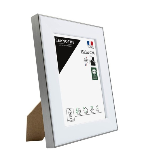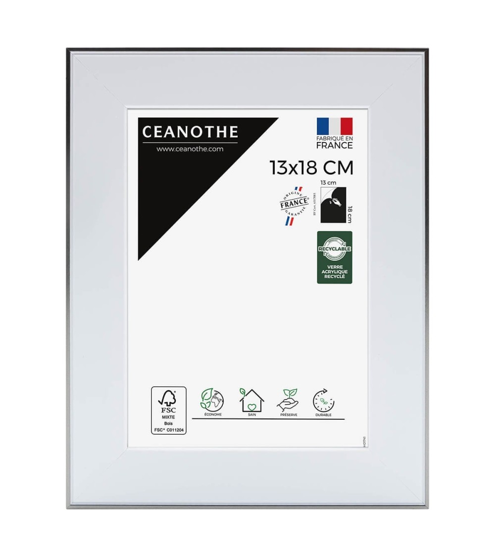 Protégez et mettez en avant toutes vos photos grâce au cadre Acier Newton et son verre acrylique recyclé. Ce cadre photo format 13x18 cm est idéal pour mettre en avant des photos, posters, affiches ou carte postale. Ajoutez un passe-partout pour protéger et sublimer dautres formats photos. La gamme propose différentes tailles et couleurs. La couleur blanche et contour Acier de ce cadre est simple, moderne et indémodable. Elle fait ressortir toutes vos plus belles uvres et photos. Cadre Home déco facile à accrocher, il trouvera naturellement sa place dans toutes les pièces de la maison : hall dentrée, salon, chambres. Le cadre sublimera facilement un grand nombre de photos avec une touche déco contemporaine et tendance. Ce cadre photo 13x18 cm est en résine recyclée, un matériau solide, léger et esthétique. Ses dimensions extérieures sont 230x180x25 mm et se compose de 4 baguettes de qualité. Il apportera de la profondeur à vos photos avec un rendu design, moderne et très qualitatif. Ce cadre apporte une jolie touche décoration industrielle. Les finitions de ce cadre sont soignées. Le style simple et tendance de cette gamme fait de ce cadre une valeur sûre que vous garderez longtemps.Fabriqués dans le respect de lenvironnement, tous les cadres design de la collection Newton sont confectionnés à partir de résine recyclée, léger et 100% recyclable, parfait pour la décoration. Depuis 1975, Ceanothe perfectionne au quotidien son savoir-faire et expertise sur lencadrement, la mise en valeur photographique et la décoration murale. Une société française engagée dans une démarche éco-responsable.