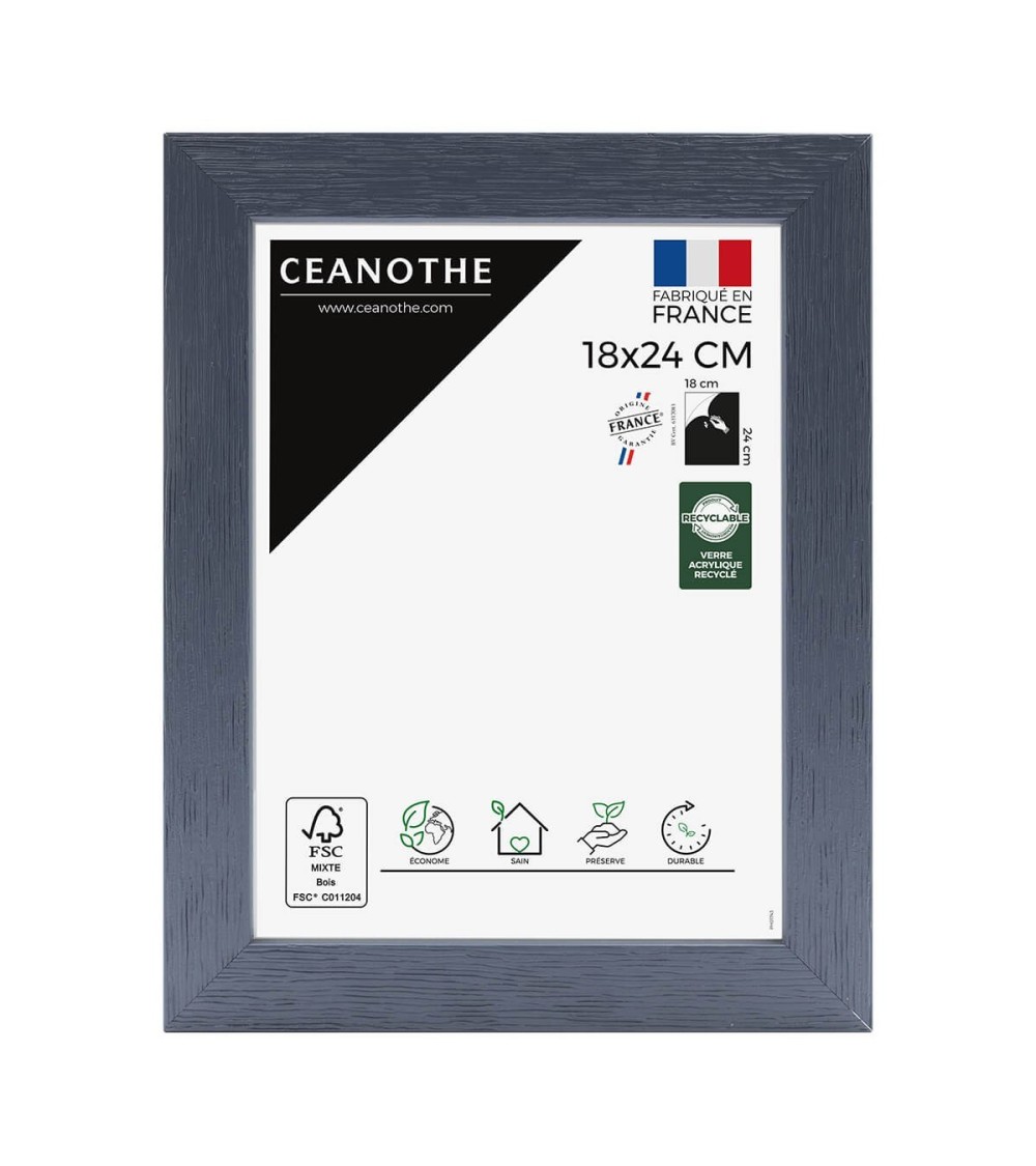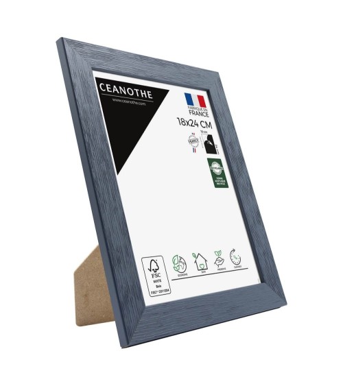 Protégez et mettez en avant toutes vos photos grâce au cadre bois karma et son verre acrylique recyclé. Ce cadre pour photo format 18x24 cm est idéal pour des photos, posters ou affiches 18x24 cm. Ajoutez un passe-partout pour protéger et sublimer d'autres formats de photo. La gamme Karma propose différentes tailles : cadre format A2, cadre format A3, cadre format A4, format A5 ou format A6. La couleur Bois Bleu du cadre est indémodable. Elle fait ressortir toutes vos plus belles uvres tout en apportant douceur et modernité à votre intérieur. Cadre Home déco facile à accrocher, il trouvera sa place dans toutes les pièces de la maison : hall d'entrée, salon, chambres. Ce cadre photo bois 24x18 cm est en bois naturel, un matériau solide, nature et esthétique, avec un verre minéral. Ses dimensions extérieures sont 28.8x22.8x1.5 cm avec 4 baguettes bois nervurées larges et plates. Il apportera de la profondeur à vos photos avec un rendu design et très qualitatif. Les finitions de ce cadre en bois sont lisses et soignées. Les teintes douces de cette gamme Karma font de ce cadre une valeur sûre que vous garderez longtemps. Fabriqués dans le respect de l'environnement, tous les cadres design de la collection Karma sont confectionnés à partir de bois naturel de pin certifié FSC. Idéal pour la décoration. Il est léger et 100% recyclable.