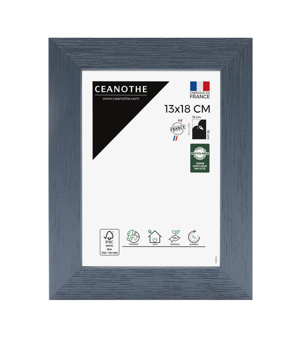 Protégez et mettez en avant toutes vos photos grâce au cadre bois karma et son verre acrylique recyclé. Ce cadre pour photo format 13x18 cm est idéal pour des photos, posters ou affiches 13x18 cm. Ajoutez un passe-partout pour protéger et sublimer d'autres formats de photo. La gamme Karma propose différentes tailles : cadre format A2, cadre format A3, cadre format A4, format A5 ou format A6. La couleur Bois Bleu du cadre est indémodable. Elle fait ressortir toutes vos plus belles uvres tout en apportant douceur et modernité à votre intérieur. Cadre Home déco facile à accrocher, il trouvera sa place dans toutes les pièces de la maison : hall d'entrée, salon, chambres. Ce cadre photo bois 18x13 cm est en bois naturel, un matériau solide, nature et esthétique, avec un verre minéral. Ses dimensions extérieures sont 22.8x17.8x1.5 cm avec 4 baguettes bois nervurées larges et plates. Il apportera de la profondeur à vos photos avec un rendu design et très qualitatif. Les finitions de ce cadre en bois sont lisses et soignées. Les teintes douces de cette gamme Karma font de ce cadre une valeur sûre que vous garderez longtemps. Fabriqués dans le respect de l'environnement, tous les cadres design de la collection Karma sont confectionnés à partir de bois naturel de pin certifié FSC. Idéal pour la décoration. Il est léger et 100% recyclable.