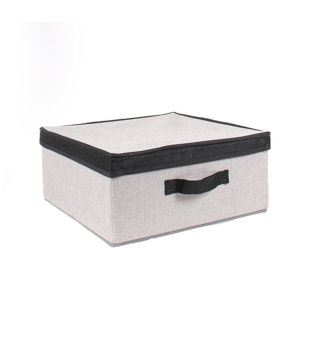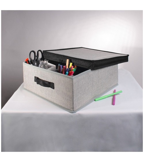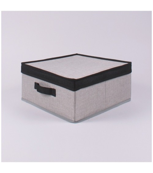 Le tiroir pliable avec couvercle et poignée a une ossature en carton recouvert de tissu polyester aspect lin.Le contraste fait de du tiroir en tissu un tiroir design et moderne.Le tiroir en tissu papyrus est de couleur gris clair avec les poignées et rebords gris anthracite.L'intérieur du tiroir pliable en tissu et son couvercle sont entièrement doublés en intissé gris clairDimensions : l 34.5 cm x P 34.5 cm x H 15.5 cmMatière : Polyester