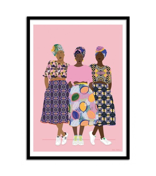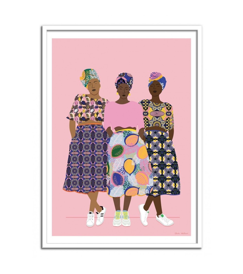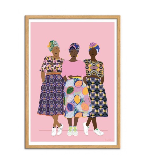 LES AFFICHES : Nos affiches sont imprimées en France, ou Union Européenne.Papier issu de forêts certifiées FSC.Affiche imprimée sur papier couché mat 250g, Haute Définition.Pour les formats d'affiches 30x40 cm : contient des marges blanches de 1,5 cm.Pour les formats d'affiches 50x70 cm : contient des marges blanches de 2 cm.OPTION CADRES : Nos cadres en bois sont fabriqués en France.Comprend une vitre en verre acrylique.Dimensions des cadres en bois 30x40 cm : Epaisseur du cadre : 15 mm, Profondeur du cadre : 20 mmDimensions des cadres en bois 50x70 cm : Epaisseur du cadre : 15 mm. Profondeur du cadre : 20 mm. L'artiste Céleste Wallaert milite pour le droit des femmes et contribue à travers son art à changer les mentalités et montrer à quel point le féminisme est beau ! Sur ce poster nous pouvons voir trois filles, trois amies, trois surs, trois femmes noirs habillées en wax. Quel style, quelle élégance ! Tout y est amour et harmonie ! Cette décoration murale est un hommage à la sororité.