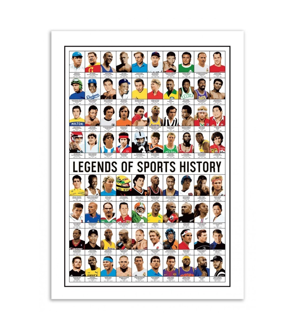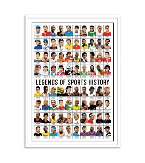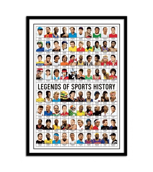 LES AFFICHES : Nos affiches sont imprimées en France, ou Union Européenne.Papier issu de forêts certifiées FSC.Affiche imprimée sur papier couché mat 250g, Haute Définition.Pour les formats d'affiches 30x40 cm : contient des marges blanches de 1,5 cm.Pour les formats d'affiches 50x70 cm : contient des marges blanches de 2 cm.OPTION CADRES : Nos cadres en bois sont fabriqués en France.Comprend une vitre en verre acrylique.Dimensions des cadres en bois 30x40 cm : Epaisseur du cadre : 15 mm, Profondeur du cadre : 20 mmDimensions des cadres en bois 50x70 cm : Epaisseur du cadre : 15 mm. Profondeur du cadre : 20 mm. Une exclusivité Wall Editions. Découvrez une mozaïque de 80 portraits regroupant les plus grands sportifs sur une seule affiche. Olivier Bourdereau réunit ces athletes de différents sports comme Maradona (Football), Michael Jordan (Basketball), Mohamed Ali (Boxe), Roger Federer (Tennis) et bien d'autres, dans une composition de type encyclopédique où l'on retrouve les informations importantes de nos icônes préférées. Convient parfaitement à tous les fans d'Histoire du sport !
