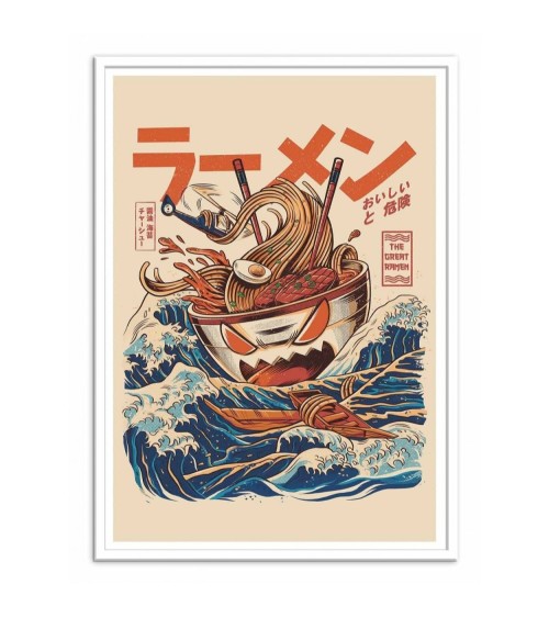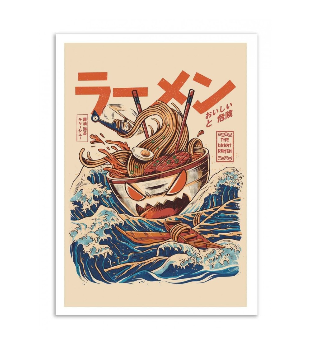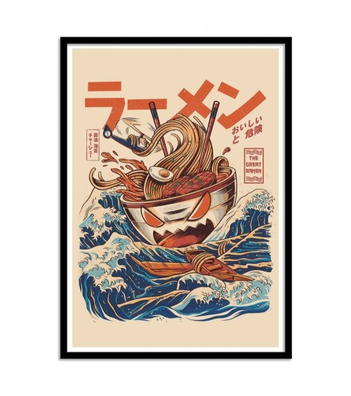 LES AFFICHES : Nos affiches sont imprimées en France, ou Union Européenne.Papier issu de forêts certifiées FSC.Affiche imprimée sur papier couché mat 250g, Haute Définition.Pour les formats d'affiches 30x40 cm : contient des marges blanches de 1,5 cm.Pour les formats d'affiches 50x70 cm : contient des marges blanches de 2 cm.OPTION CADRES : Nos cadres en bois sont fabriqués en France.Comprend une vitre en verre acrylique.Dimensions des cadres en bois 30x40 cm : Epaisseur du cadre : 15 mm, Profondeur du cadre : 20 mmDimensions des cadres en bois 50x70 cm : Epaisseur du cadre : 15 mm. Profondeur du cadre : 20 mm. Les posters pop culture de l'artiste Ilustrata font le bonheur de tous les amateurs du Japon, de ses mangas et de sa cuisine ! Cette décoration murale est une publicité pour se faire livrer un bol bouillant du meilleur plat du monde : le ramen ! Ce plat est ici illustré comme un monstre d'une fiction apocalyptique ! Ne sous estimons pas la force du ramen ! Cette délicieuse affiche est une idée cadeau géniale pour tous les fans de la gastronomie nipponne ! A accrocher dans nos cuisines !