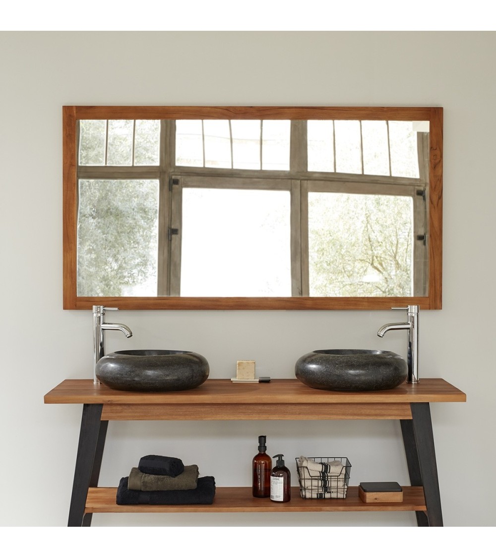 Ce grand miroir de salle de bain ira parfaitement au dessus de 2 vasques. Fabriqué en bois de teck, il conserve sa teinte naturelle pour capter encore mieux la lumière. Caractéristiques : Matière : Teck brut - Couleur : Bois naturel - Epaisseur : 3 cm - Longueur : 150 cm - Largeur : 80 cm - Poids : 7 kg - Garantie : 2 ans - Montage : Livré monté. Les + : Teck brut Dimensions généreuses - Imputrescible.