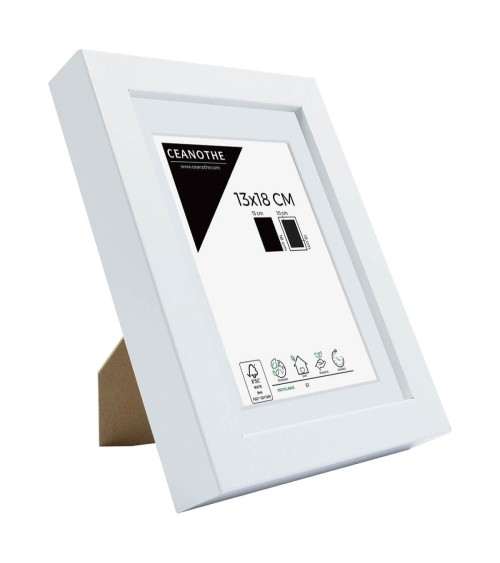 Protégez et mettez en avant toutes vos photos grâce au cadre Blanc Oslo et son verre minéral. Ce cadre photo format 13x18 cm est idéal pour mettre en avant des photos, posters ou affiches grand format de 13x18 cm grâce à son passe-partout pour protéger et mettre en avant tous les formats de photos et posters.La couleur Blanc de ce cadre est moderne et indémodable. Elle fait ressortir toutes vos plus belles uvres et photos tout en apportant un contraste élégant à votre intérieur. Cadre Home déco facile à accrocher, il trouvera naturellement sa place dans toutes les pièces de la maison : hall dentrée, salon, chambres à coucher. Le cadre sublimera facilement un grand nombre de photos avec une touche déco très tendance et chic.Ce cadre photo bois 13x18 cm est en bois reconstitué, un matériau solide, nature et esthétique. Ses dimensions extérieures sont 230x180x30 mm et se compose de 4 baguettes travaillées avec passe-partout qui lui apporte modernité. Il apportera de la profondeur à vos photos avec un rendu design très qualitatif. Les finitions de ce cadre sont soignées. La couleur de cette gamme Oslo fait de ce cadre une valeur sûre que vous garderez longtemps. Fabriqués dans le respect de lenvironnement, tous les cadres de la collection Oslo sont confectionnés à partir de bois reconstitué certifié FSC. Parfait pour la décoration, il est léger et 100% recyclable;Depuis 1975, Ceanothe perfectionne au quotidien son savoir-faire et expertise sur lencadrement, la mise en valeur photographique et la décoration murale. Une société française engagée dans une démarche éco-responsable.