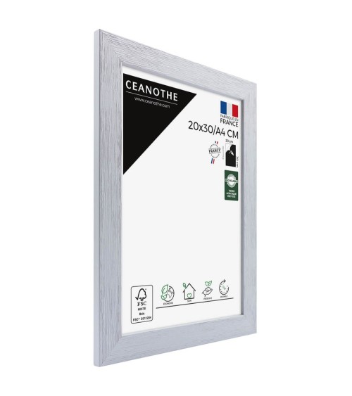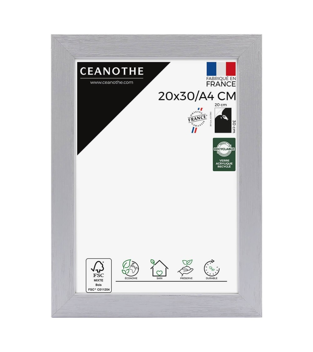 Protégez et mettez en avant toutes vos photos grâce au cadre bois karma et son verre acrylique recyclé. Ce cadre pour photo format 20x30 cm est idéal pour des photos, posters ou affiches 20x30 cm. Ajoutez un passe-partout pour protéger et sublimer d'autres formats de photo. La gamme Karma propose différentes tailles : cadre format A2, cadre format A3, cadre format A4, format A5 ou format A6. La couleur Bois Gris du cadre est indémodable. Elle fait ressortir toutes vos plus belles uvres tout en apportant douceur et modernité à votre intérieur. Cadre Home déco facile à accrocher, il trouvera sa place dans toutes les pièces de la maison : hall d'entrée, salon, chambres. Ce cadre photo bois 30x20 cm est en bois naturel, un matériau solide, nature et esthétique, avec un verre minéral. Ses dimensions extérieures sont 34.8x25.8x1.2 cm avec 4 baguettes bois nervurées larges et plates. Il apportera de la profondeur à vos photos avec un rendu design et très qualitatif. Les finitions de ce cadre en bois sont lisses et soignées. Les teintes douces de cette gamme Karma font de ce cadre une valeur sûre que vous garderez longtemps. Fabriqués dans le respect de l'environnement, tous les cadres design de la collection Karma sont confectionnés à partir de bois naturel de pin certifié FSC. Idéal pour la décoration. Il est léger et 100% recyclable.