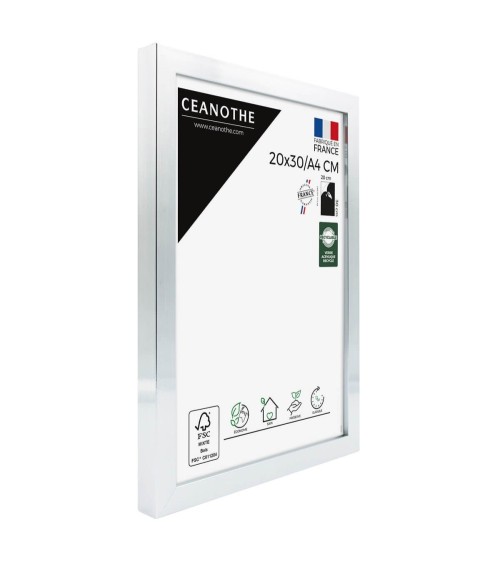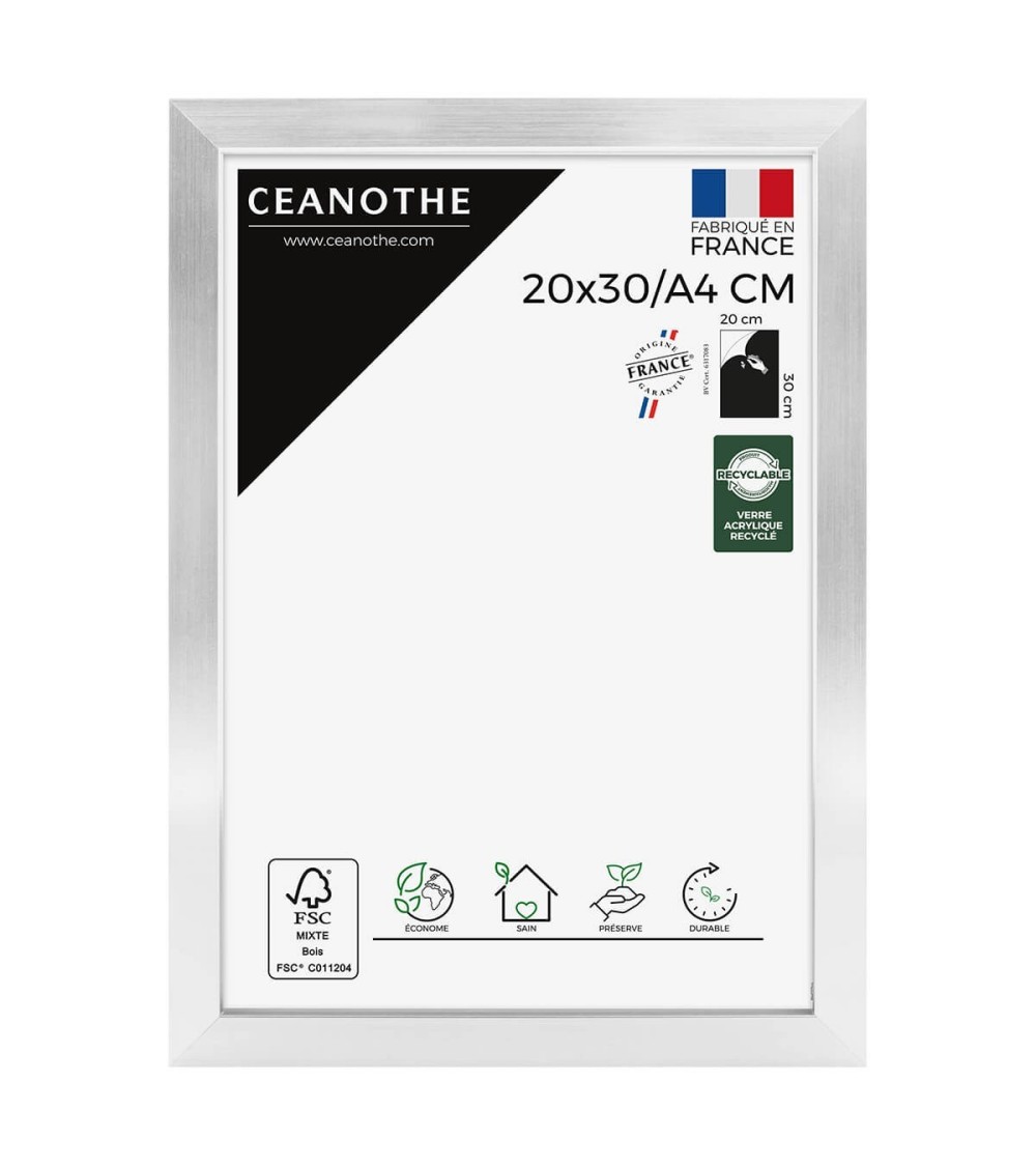 Protégez et mettez en avant toutes vos photos grâce au cadre Precious et son verre acrylique recyclé. Ce cadre photo format 20x30 cm/A4 est idéal pour mettre en avant des photos, posters ou affiches de 20x30 cm/A4. Ajoutez un passe-partout pour protéger et mettre en avant dautres formats de photos et posters avec ce cadre.La couleur Acier avec finition laquée de ce cadre est moderne et indémodable. Elle fait ressortir toutes vos plus belles uvres et photos tout en apportant un effet élégant à votre intérieur. Cadre Home déco facile à accrocher, il trouvera naturellement sa place dans toutes les pièces de la maison : hall dentrée, salon, chambres à coucher. Le cadre sublimera facilement un grand nombre de photos avec une touche déco très tendance. Ce cadre photo 20x30 cm/A4 est en résine recyclée, un matériau solide et esthétique. Ses dimensions extérieures sont 327x237x22 mm et se compose de 4 baguettes travaillées de qualité. Il apportera de la profondeur à vos photos avec un rendu design très qualitatif. Les finitions de ce cadre sont soignées. La couleur de cette gamme Precious fait de ce cadre une valeur sûre que vous garderez longtemps. Depuis 1975, Ceanothe perfectionne au quotidien son savoir-faire et expertise sur lencadrement, la mise en valeur photographique et la décoration murale. Une société française engagée dans une démarche éco-responsable.