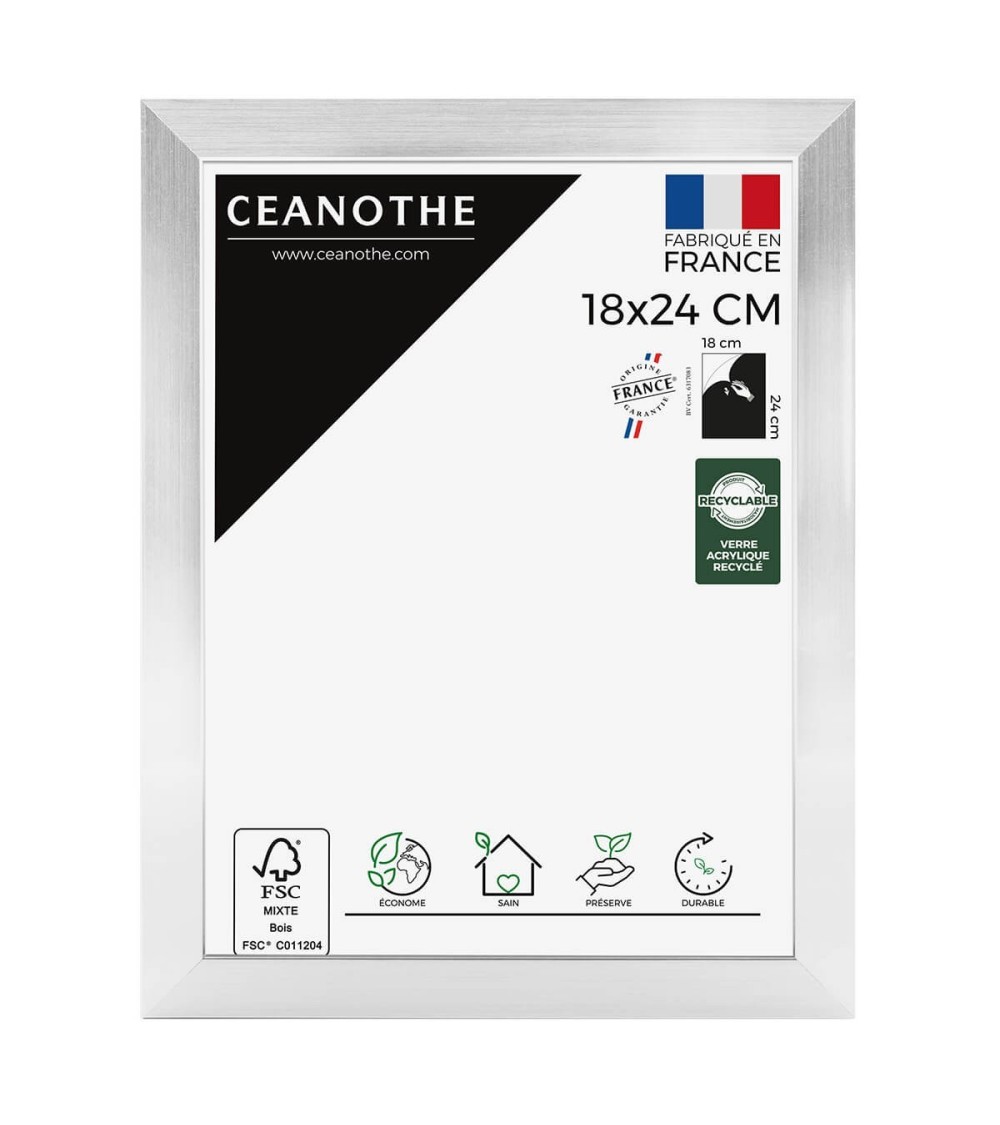 Protégez et mettez en avant toutes vos photos grâce au cadre Precious et son verre acrylique recyclé. Ce cadre photo format 18x24 cm est idéal pour mettre en avant des photos, posters ou affiches de 18x24 cm. Ajoutez un passe-partout pour protéger et mettre en avant dautres formats de photos et posters avec ce cadre.La couleur Acier avec finition laquée de ce cadre est moderne et indémodable. Elle fait ressortir toutes vos plus belles uvres et photos tout en apportant un effet élégant à votre intérieur. Cadre Home déco facile à accrocher, il trouvera naturellement sa place dans toutes les pièces de la maison : hall dentrée, salon, chambres à coucher. Le cadre sublimera facilement un grand nombre de photos avec une touche déco très tendance. Ce cadre photo 18x24 cm est en résine recyclée, un matériau solide et esthétique. Ses dimensions extérieures sont 267x207x25 mm et se compose de 4 baguettes travaillées de qualité. Il apportera de la profondeur à vos photos avec un rendu design très qualitatif. Les finitions de ce cadre sont soignées. La couleur de cette gamme Precious fait de ce cadre une valeur sûre que vous garderez longtemps. Depuis 1975, Ceanothe perfectionne au quotidien son savoir-faire et expertise sur lencadrement, la mise en valeur photographique et la décoration murale. Une société française engagée dans une démarche éco-responsable.
