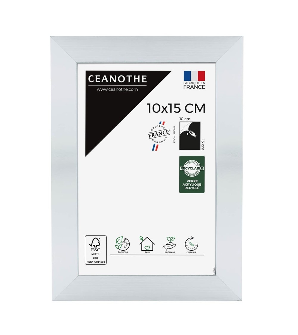 Protégez et mettez en avant toutes vos photos grâce au cadre Precious et son verre acrylique recyclé. Ce cadre photo format 10x15 cm est idéal pour mettre en avant des photos, posters ou affiches de 10x15 cm. Ajoutez un passe-partout pour protéger et mettre en avant dautres formats de photos et posters avec ce cadre.La couleur Acier avec finition laquée de ce cadre est moderne et indémodable. Elle fait ressortir toutes vos plus belles uvres et photos tout en apportant un effet élégant à votre intérieur. Cadre Home déco facile à accrocher, il trouvera naturellement sa place dans toutes les pièces de la maison : hall dentrée, salon, chambres à coucher. Le cadre sublimera facilement un grand nombre de photos avec une touche déco très tendance. Ce cadre photo 10x15 cm est en résine recyclée, un matériau solide et esthétique. Ses dimensions extérieures sont 177x127x25 mm et se compose de 4 baguettes travaillées de qualité. Il apportera de la profondeur à vos photos avec un rendu design très qualitatif. Les finitions de ce cadre sont soignées. La couleur de cette gamme Precious fait de ce cadre une valeur sûre que vous garderez longtemps. Depuis 1975, Ceanothe perfectionne au quotidien son savoir-faire et expertise sur lencadrement, la mise en valeur photographique et la décoration murale. Une société française engagée dans une démarche éco-responsable.