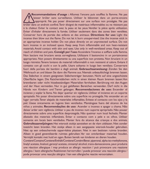 Plus qu'un rituel ou même un art de vivre, l'encens est une véritable expérience des sens et de l'âme.Un parfum floral poudréNote de tête : mandarine, feuilles de violetteNote de cur : absolue d'iris, pétales de rose, abricotNote de fond : bois de cachemire, musc végétal, fève tonka