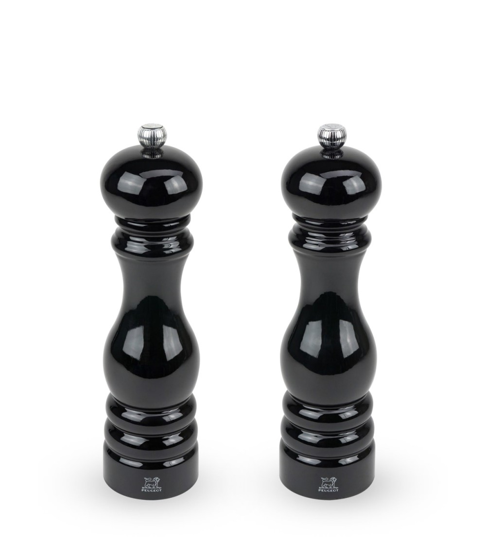 Par sa couleur noire glossy ultra tendance et sa forme galbée emblématique, le duo de moulins à poivre et à sel Paris 22 cm devient un véritable objet déco sur votre table. Ce duo de moulins en bois est tourné, peint, assemblé en France dans la Manufacture Peugeot. Le modèle Paris est une référence incontournable dans l'univers des arts de la table. Crée il y a plus de 30 ans, il est désormais devenu un instrument indispensable du quotidien des chefs à travers le monde. Le duo de moulins à poivre et à sel Paris 22 cm, sans sa version laquée noire brillante est particulièrement apprécié des amateurs de contemporain-chic. Son bois de hêtre teinté d'un magnifique noir laqué brillant, ultra-tendance, s'associe parfaitement à son design très classique. Avec son bouton en métal brillant marqué de la tête du lion, il créé la différence ! Plus qu'un détail design, ce bouton permet de régler facilement la taille de mouture du poivre ou du sel. Le duo Paris laqué noir 12 cm est fabriqué en France, au cur de la Franche-Comté. Les mécanismes à poivre et à sel de ces deux moulins, également fabriqués en Franche-Comté, sont garantis sans limitation de durée.
