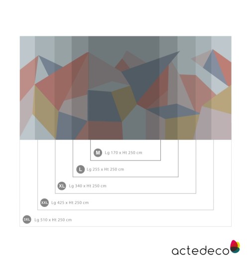 Entre paysages graphiques et conception architecturale, ces papiers peints panoramiques transforment votre intérieur et apportent de la couleur à vos murs. Papier peint Intissé Lavable Lisse Mat 150g sans PVC à encoller - Encres Latex sans solvant et sans COV - Fabrication Française4 couleurs au choix : Rose, bleu, rouge et vert5 tailles au choix : - M : Lg 170 x Ht 250 cm en 2 lés de 85 cm- L : Lg 255 x Ht 250 cm en 3 lés de 85 cm- XL : Lg 340 x Ht 250 cm en 4 lés de 85 cm- XXL : Lg 425 x Ht 250 cm en 5 lés de 85 cm- 3XL : Lg 510 x Ht 250 cm en 6 lés de 85 cm. Pose bord à bord pour une pose facile.Intissé à base de fibres cellulosiques et polyester liées par un acrylique sans PVC 150g. Impression encres Latex sans solvant et sans COV.Aspect mat lisse (calandré). Très bon rendu des couleurs. Très bonne stabilité dimensionnelle. Cache les petites imperfections du mur, la préparation du mur est simplifiée. Bonne résistance à la déchirure lors de la pose. Pose facile.Se nettoie avec un léger coup d'éponge à l'eau savonneuse.