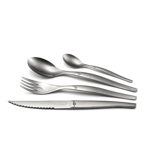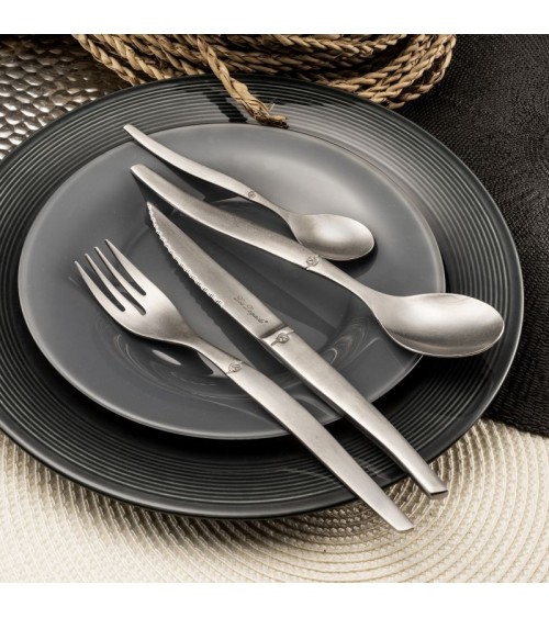 Ensemble de 48 couverts Laguiole pour 12 personnes de la gamme Jet. Couverts en acier inox en finition vieillie vintage. Lame micro-dentée pour une coupe optimale et un tranchant longue duréeLe Jet est laguiole de table au design contemporain, souligné par un poinçon d'abeille moderne et stylisé. Le Jet se décline ici dans une teinte champagne élégante qui en fait le laguiole le plus stylé de sa génération.Lou Laguiole® signe un design exclusif et traditionnel. Pour concevoir cette authentique gamme de couteaux Laguiole, nous mobilisons tout notre savoir-faire coutelier. Lou Laguiole® est une marque déposée et distribuée exclusivement par Amefa en France et dans le monde.