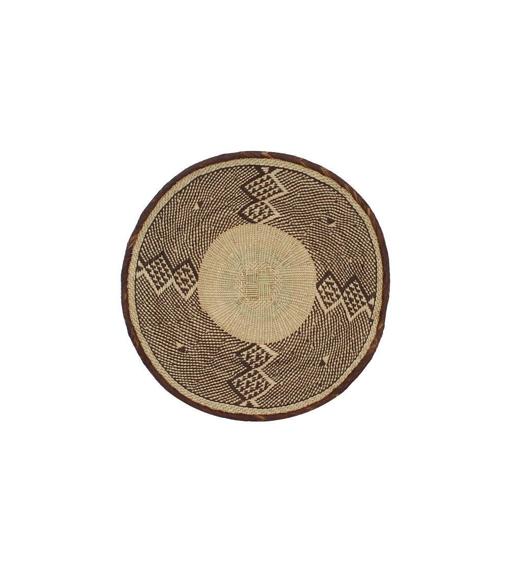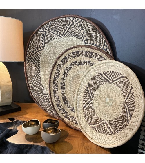 Pour habiller son mur de la plus belle manière, ce panier typique africain fabriqué à partir de fibres végtales tissées à la main est tout simplement adorable. On craque pour le style ethnique et bohème chic de ce grand panier tissé avec ses touches de noires sous cette forme ronde. Souvent utilisé comme décoration murale, laissez parler votre imagination! Il est important de noter que toutes les pièces sont uniques et varient en dimension (entre 39 et 44 cm) et en motif (couleur et dessin). Panier mural en fibres végétales Tissé à la main au ZIMBABWE Dimensions : 39/44 CM (aléatoire) Usage intérieur ou extérieur abrité. Ne pas exposer aux intempéries. Toutes les pièces étant uniques, le motif et la couleur du tissage est aléatoireNettoyer à l'aide d'un chiffon sec
