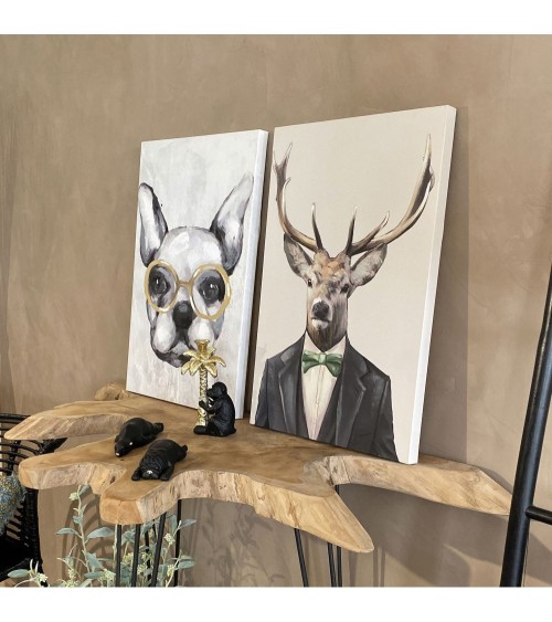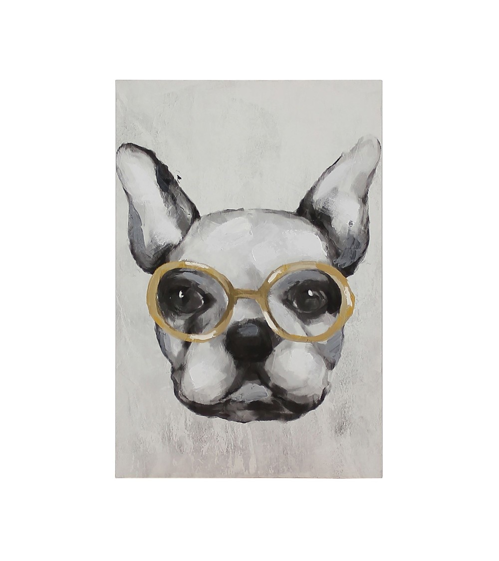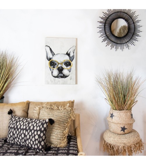 Toujours dans l'air du temps, dans une chambre ou dans un salon, cette toile imprimée avec pour représentation le bouledogue, ce petit chien frenchie que tout le monde adore apportera LA touche originale à votre intérieur! Le petit plus, les lunettes dorées qui apportent une petite touche pop. Toile de polyester avec impression tête de bouledogue Cadre bois de pin Couleurs neutres avec une touche de pop Dimensions : 40x60 cm Nettoyer à l'aide d'un chiffon sec