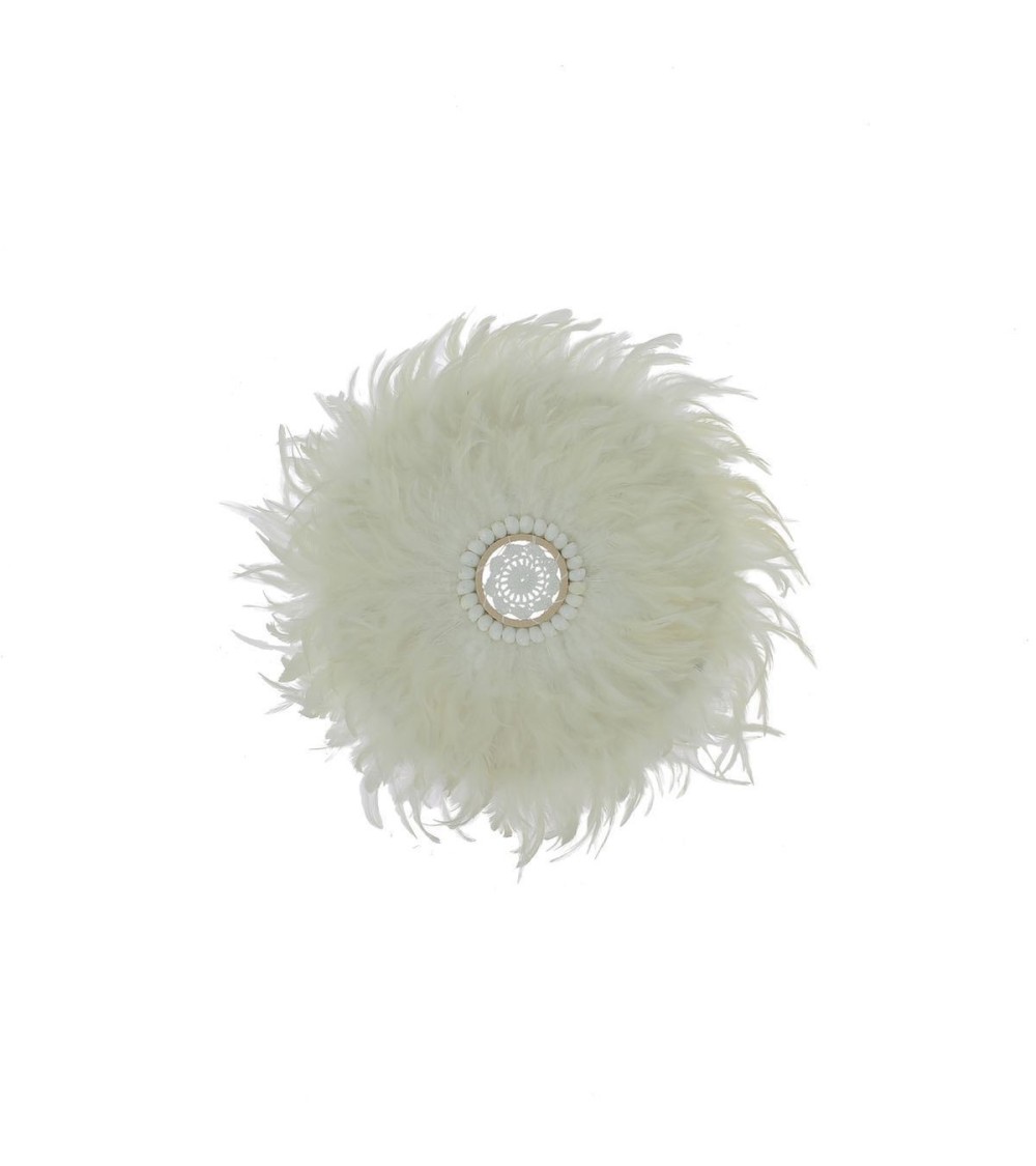 Ce Jujuhat se présente tel un soleil ethnique composé de plumes et de coquillages qui illuminera votre intérieur. Une touche chaleureuse tout en délicatesse pour apporter de l'authenticité et une jolie partie de rêverie grâce à sa partie centrale faite en crochet naturel envoûtant. Decoration murale en plumes de coq blanches et coquillages Fil de coton en crochet central Crochet d'attache arrière Dimensions ø40cm Produit fait main.Nettoyer à l'aide d'un chiffon sec
