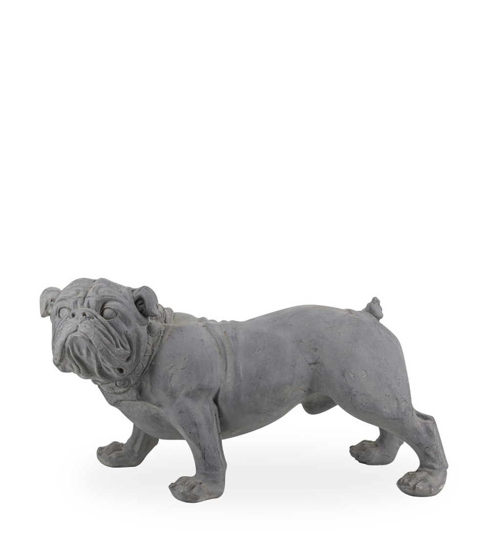 Statue décorative dun chien bulldog debout, sculptée en résine couleur grise et effet vieilli. Aucun assemblage requis.