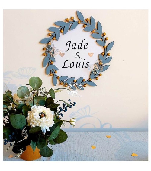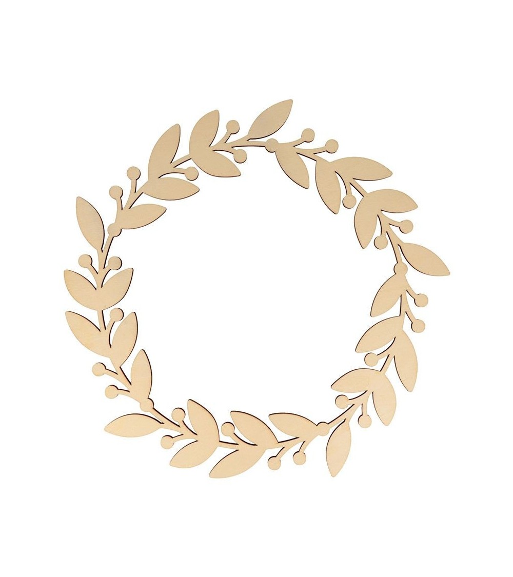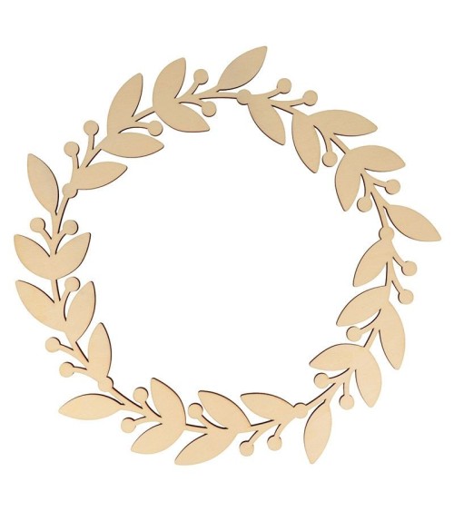 Couronne feuilles et baies 35 cm. Couronne de feuilles et baies en bois mesurant 35 cm de diamètre et 0,7 cm d'épaisseur, à décorer et à personnaliser. Vous pouvez la peindre, coller du papier, ajouter des embellissements.