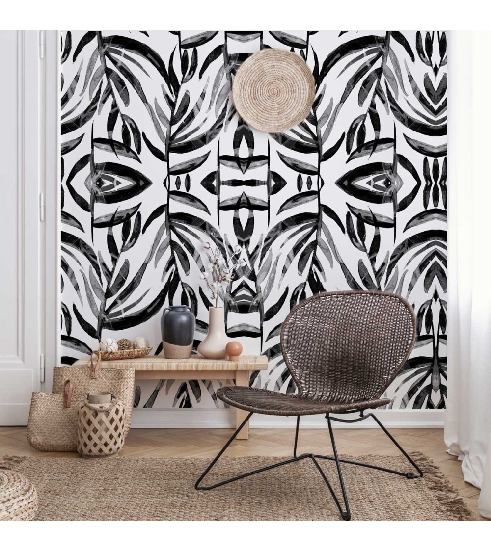 Dans l'air du temps, ce décor papier peint panoramique Ethnique mèle graphisme et végétation.Papier peint Intissé Lavable Lisse Mat 150g sans PVC à encoller - Encres Latex sans solvant et sans COV - Fabrication Française2 couleurs au choix: Noir ou Vert5 tailles aux choix : - M : Lg 170 x Ht 250 cm en 2 lés de 85 cm- L : Lg 255 x Ht 250 cm en 3 lés de 85 cm- XL : Lg 340 x Ht 250 cm en 4 lés de 85 cm- XXL : Lg 425 x Ht 250 cm en 5 lés de 85 cm