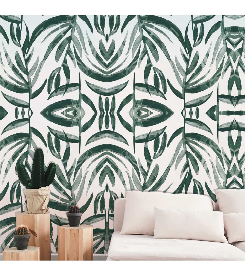 Dans l'air du temps, ce décor papier peint panoramique Ethnique mèle graphisme et végétation.Papier peint Intissé Lavable Lisse Mat 150g sans PVC à encoller - Encres Latex sans solvant et sans COV - Fabrication Française2 couleurs au choix: Noir ou Vert5 tailles aux choix : - M : Lg 170 x Ht 250 cm en 2 lés de 85 cm- L : Lg 255 x Ht 250 cm en 3 lés de 85 cm- XL : Lg 340 x Ht 250 cm en 4 lés de 85 cm- XXL : Lg 425 x Ht 250 cm en 5 lés de 85 cm