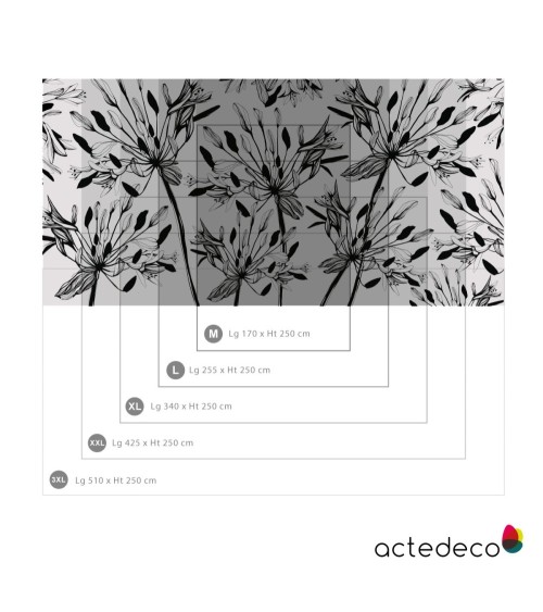 Des Fleurs définissants l'espace intérieur, ce décor Fleur graphique papier peint panoramique apporte élégance et modernité.Papier peint Intissé Lavable Lisse Mat 150g sans PVC à encoller - Encres Latex sans solvant et sans COV - Fabrication Française2 couleurs : Noir et blanc ou Gris5 tailles aux choix : - M : Lg 170 x Ht 250 cm en 2 lés de 85 cm- L : Lg 255 x Ht 250 cm en 3 lés de 85 cm- XL : Lg 340 x Ht 250 cm en 4 lés de 85 cm- XXL : Lg 425 x Ht 250 cm en 5 lés de 85 cm- 3XL : Lg 510 x Ht 250 cm en 6 lés de 85 cmPose bord à bord pour une pose facile
