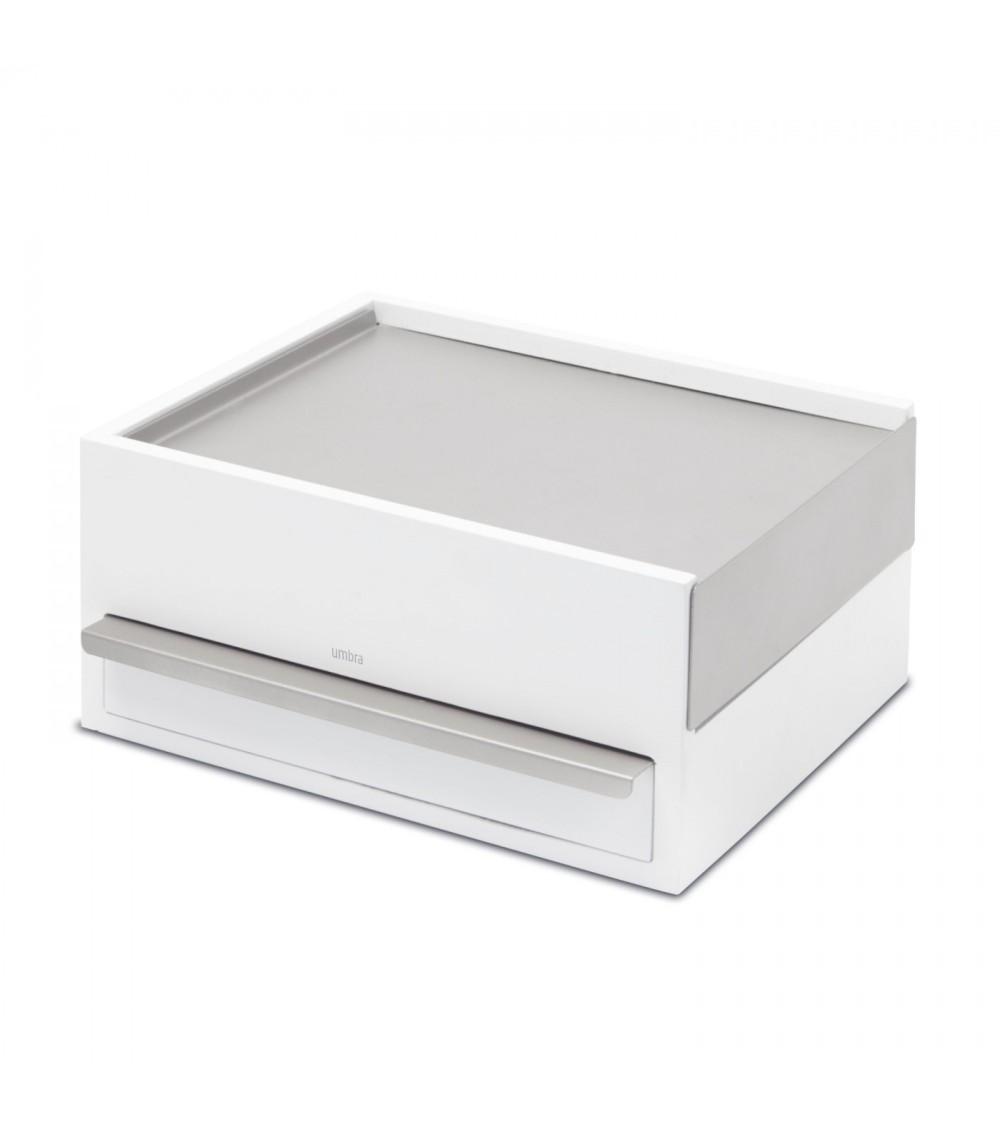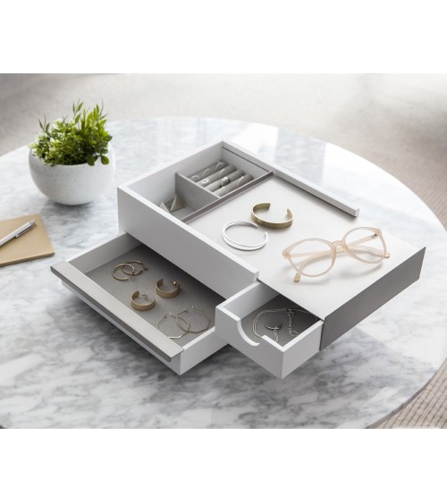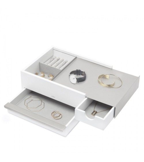 Une boite à bijoux originale et très contemporaine dans les tons zen de bois et gris ou blanc laqué. Plusieurs rangements faciles d'accès pour bagues, colliers et bracelets munis de feutrines pour protéger tous vos accessoires Dimensions : 27.9 x 20.3 x 10.2 cm Matière : bouleau, métal laqué
