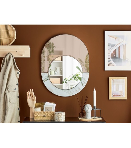 Miroir mural décoratif. Cette pièce murale merveilleuse sera une décoration parfaite pour n'importe quel intérieur. Le cadre ovale connecte la simplicité avec l'élégance et le design moderne. Un miroir rond classique entouré d'un verre de couleur rose doré et d'un élément avec effet marbre embellira n'importe quel couloir ou chambre.Détails: Type de produit: Miroir Style: Moderne Couleur principale: Blanc Type de matière: Verre Matière principale: Verre Matière secondaire: MDF Forme: Ovale Orientation: Vertical Dimensions: Profondeur: 2 cm Largeur: 50 cm Hauteur: 65 cm Poids: 4 kg L`offre inclue: 1 x Miroir Caractéristiques clés: Cadre équipé de crochets de suspension pour accrochage au mur , Décoratif et fonctionnel, Agrandit l'intérieur visuellement, Style élégant, Un style simple s'adaptant à tout type d'intérieur, Solution parfaite pour la chambre et le salon Informations d`assemblage: Ne nécessite pas d'assemblage Conseils de maintenance: Verre: 1.Nettoyez avec un chiffon et un nettoyant doux ou un conditionneur pour verre. Essuyez immédiatement après le nettoyage 2.Pour éviter les rayures, n'utilisez pas de nettoyants crème.