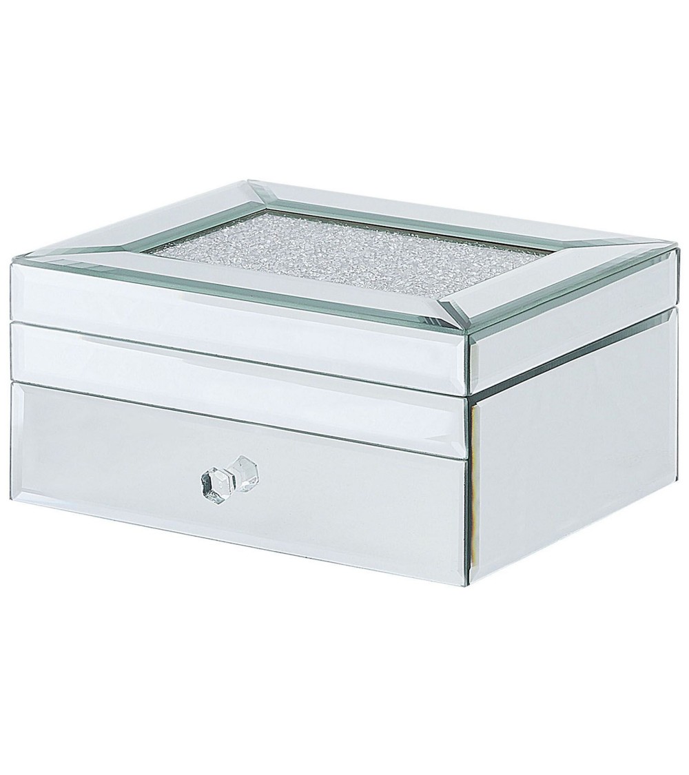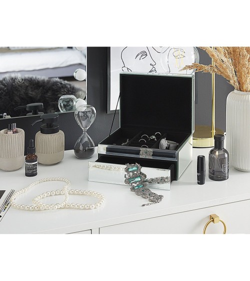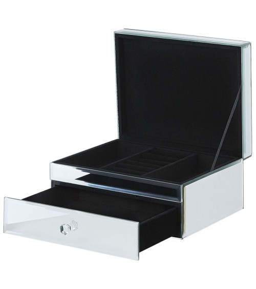 Boîte à bijoux argentée en verre. Cette boîte à bijoux argentée en verre est un choix idéal pour une coiffeuse, une table de maquillage ou une salle de bain luxueuse. Elle offre beaucoup d'espace pour des boucles d'oreilles, bagues, bracelets et colliers ou accessoires pour cheveux. La boîte protège des objets de la poussière et des rayures tout en gardant le tout en une seule place prête à porter. Détails: Type de produit: Boîte à bijoux Style: Glamour Couleur principale: Argenté Type de matière: Verre Matière principale: Verre Fabriqué à la main: Non Dimensions: Profondeur: 17 cm Largeur: 22 cm Hauteur: 11 cm Poids: 2 kg L`offre inclue: 1 x Boîte à bijoux Caractéristiques clés: Décoratif et fonctionnel, Finition en miroir pour un look glamour, Style élégant, Fabrication et fintion irréprochables, Espace de stockage supplémentaire Informations d`assemblage: Ne nécessite pas d'assemblage Informations supplémentaires: Le produit a besoin d'un certain temps pour atteindre sa forme définitive. Nous recommandons de le déballer le plus tôt possible et de lui laisser jusqu'à 48 heures pour se redresser. Pour un meilleur effet, il est conseillé de placer à l'intérieur un objet de grande taille qui remplira tout le panier. Conseils de maintenance: Verre: 1.Pour éviter les rayures, n'utilisez pas de nettoyants crème 2.Nettoyez avec un chiffon et un nettoyant doux ou un conditionneur pour verre. Essuyez immédiatement après le nettoyage.