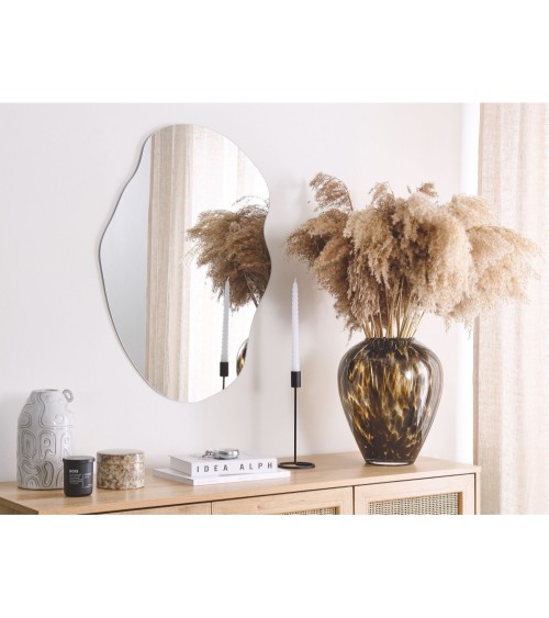 Miroir sans cadre avec forme originale. Décorez votre salon ou salle de bains avec ce miroir unique et accrocheur. Sa forme irrégulière en fait un véritable accroche-regard. Il est facile à nettoyer et, grâce aux crochets situés à l'arrière, il peut être accroché au mur aussi bien horizontalement que verticalement. Le miroir peut être assorti à une variété d'intérieurs, mais il sera idéal dans les intérieurs minimalistes d'inspiration scandinave. Détails: Type de produit: Miroir Style: Moderne Couleur principale: Argenté Type de matière: Verre Matière principale: Verre Forme: Difforme Orientation: Vertical Dimensions: Profondeur: 1 cm Largeur: 50 cm Hauteur: 70 cm Poids: 2 kg L`offre inclue: 1 x Miroir Caractéristiques clés: Cadre équipé de crochets de suspension pour accrochage au mur , Agrandit l'intérieur visuellement, Style minimaliste, Facile à entretenir et extrêmement durable, De haute qualité Informations d`assemblage: Ne nécessite pas d'assemblage Conseils de maintenance: Verre: 1.Nettoyez avec un chiffon et un nettoyant doux ou un conditionneur pour verre. Essuyez immédiatement après le nettoyage 2.Pour éviter les rayures, n'utilisez pas de nettoyants crème.