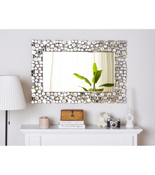 Miroir mural rectangulaire avec cadre décoratif en cristaux de verre. Que ce soit dans le couloir, la chambre, la salle de bains ou le salon - ce superbe miroir déco est un ajout de style qui remplira votre intérieur d'une généreuse dose de brillance. Son cadre hautement décoratif en fait un véritable bijou déco de style glamour très en vogue. Les magnifiques cristaux scintillants en verre acrylique (plexiglass) sont capables d'attirer tous les regards et d'apporter beaucoup de lumière à votre maison. Selon vos besoins, vous pouvez accrocher ce miroir mural verticalement ou horizontalement. Détails: Type de produit: Miroir Style: Glamour Couleur principale: Argenté Type de matière: Verre Matière principale: MDF Matière secondaire: Plexiglass Forme: Rectangulaire Finition: Brillant Orientation: Horizontal Dimensions: Profondeur: 2 cm Largeur: 60 cm Hauteur: 90 cm Poids: 11 kg L`offre inclue: 1 x Miroir Caractéristiques clés: Cadre équipé de crochets de suspension pour accrochage au mur , Solution parfaite pour la chambre et le salon, Agrandit l'intérieur visuellement, Décoratif et fonctionnel, Matières de haute qualité Informations d`assemblage: Ne nécessite pas d'assemblage Conseils de maintenance: Plexiglass: 1.Nettoyez avec un chiffon et un détergent doux. Essuyez bien après le nettoyage. Verre: 1.Pour éviter les rayures, n'utilisez pas de nettoyants crème 2.Nettoyez avec un chiffon et un nettoyant doux ou un conditionneur pour verre. Essuyez immédiatement après le nettoyage.
