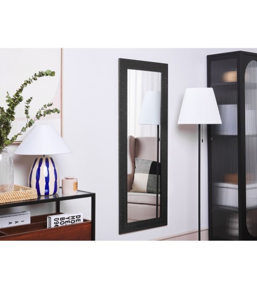 Miroir suspendu rectangulaire avec cadre noir au style moderne. Ajoutez une touche délégance à votre maison avec ce miroir mural rectangulaire. Doté d'un cadre noir à motif géométrique délicat, il élargira bien l'espace visuel de votre intérieur. Vous pouvez accrocher ce miroir verticalement ou horizontalement, selon vos besoins et envies et ladapter au décor de votre chambre ou couloir d'entrée.Détails: Type de produit: Miroir Style: Moderne Couleur principale: Noir Type de matière: Matériaux synthétiques Matière principale: Matière synthétique Matière secondaire: Verre Forme: Rectangulaire Finition: Brillant Orientation: Horizontal Dimensions: Profondeur: 2 cm Largeur: 50 cm Hauteur: 130 cm Poids: 7 kg L`offre inclue: 1 x Miroir Caractéristiques clés: Cadre équipé de crochets de suspension pour accrochage au mur , Agrandit l'intérieur visuellement, Décoratif et fonctionnel, Style élégant, Facile à entretenir Informations d`assemblage: Ne nécessite pas d'assemblage Conseils de maintenance: Matière synthétique: 1.Nettoyez avec un chiffon et un détergent doux, essuyez bien ensuite. Verre: 1.Nettoyez avec un chiffon et un nettoyant doux ou un conditionneur pour verre. Essuyez immédiatement après le nettoyage 2.Pour éviter les rayures, n'utilisez pas de nettoyants crème.