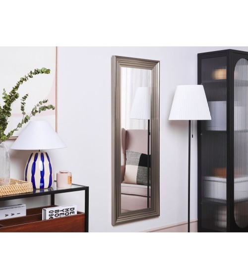 Miroir mural avec cadre moderne. Ce miroir mural moderne rajoutera une touche d'élégance et de bien être et élargira l'espace visuel de votre intérieur. La bordure moderne rajoute une touche supplémentaire de classe à ce véritable bijou de design. Ce dernier peut également être accroché verticalement ou horizontalement selon vos besoins et envies. Complétez votre décoration avec cet accessoire d'une grande élégance dans votre salon ou votre chambre. Ce miroir est protégé à l'arrière par du papier. Ceci n'est pas un élément d'emballage et ne doit en aucun cas être retiré.Détails: Type de produit: Miroir Style: Moderne Couleur principale: Argenté Type de matière: Matériaux synthétiques Matière principale: Matière synthétique Matière secondaire: Verre Forme: Rectangulaire Finition: Plâtré Orientation: Vertical Dimensions: Profondeur: 3 cm Largeur: 50 cm Hauteur: 130 cm Poids: 8 kg L`offre inclue: 1 x Miroir Caractéristiques clés: Cadre équipé de crochets de suspension pour accrochage au mur , Agrandit l'intérieur visuellement, Style élégant, Décoratif et fonctionnel, Matières de haute qualité Informations d`assemblage: Ne nécessite pas d'assemblage Conseils de maintenance: Matière synthétique: 1.Nettoyez avec un chiffon et un détergent doux, essuyez bien ensuite. Verre: 1.Nettoyez avec un chiffon et un nettoyant doux ou un conditionneur pour verre. Essuyez immédiatement après le nettoyage 2.Pour éviter les rayures, n'utilisez pas de nettoyants crème.