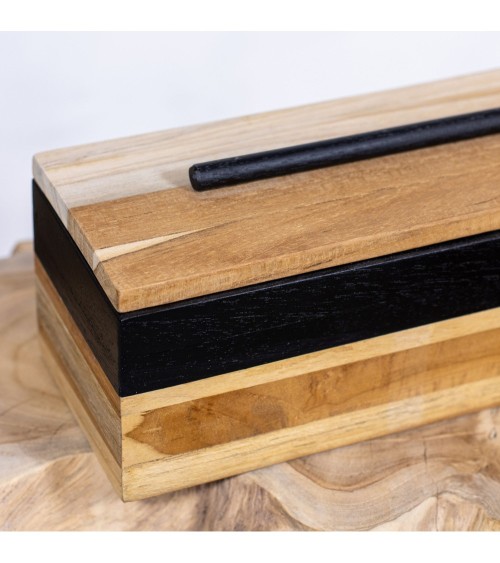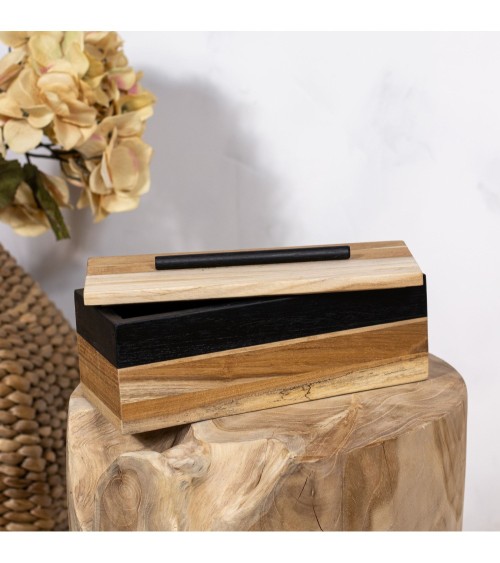 Posée sur une table, commode, étagère, ou sur un bureau, la boîte JADE sera toujours vous ravir! Pratique, cette jolie boîte rectangle, pourra vous servir comme rangement pour vos bijoux, et petits accessoires... Boite en bois JADE, avec couvercle. Matériau: bois Couleur: naturel et noir. Forme: rectangle. Dimensions: 24 X 10 X 10 CMNettoyer à l'aide d'un chiffon sec