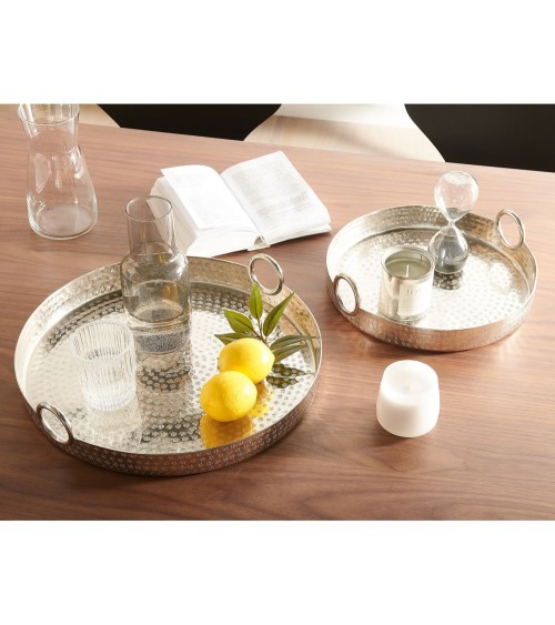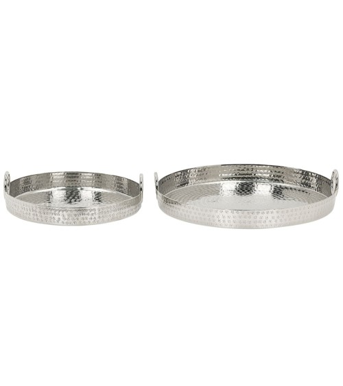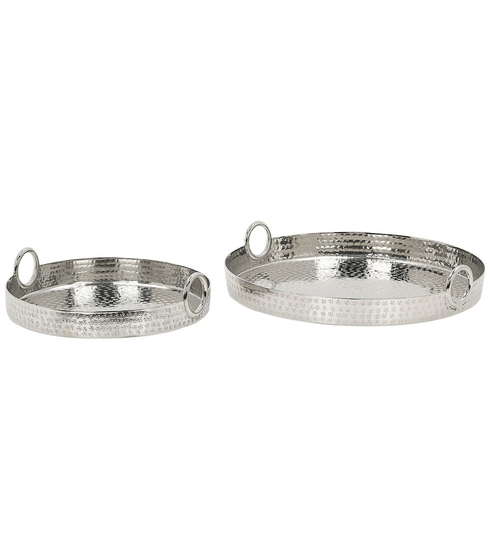 Set de 2 plateaux de service décoratifs en aluminium argenté. Cet ensemble de plateaux de service, à la fois pratiques et très décoratifs, embellira chaque maison. Grâce à leur finition brillante et argentée et le motif original, ils s'adapteront facilement à tout salon glamour, industriel, moderne ou minimaliste. Étant fabriqué en aluminium, ce set de plateaux est ultra léger, donc très confortable à utiliser. Grâce aux poignées situées de chaque côté vous pouvez les porter sans effort. Le design unique de ces beaux plateaux permet aussi de les utiliser comme accessoires déco à part entière, des plateaux à bougies par exemple, ou pour y ranger vos petits objets quotidiens. Détails: Type de produit: Plateau Style: Glamour Couleur principale: Argenté Type de matière: Métal Matière principale: Aluminium Finition: Peint Fabriqué à la main: Oui Dimensions: Profondeur: 41 cm Largeur: 41 cm Hauteur: 5 cm Poids: 2 kg L`offre inclue: 2 x Plateau Caractéristiques clés: Fabriqué à la main avec le plus grand soin, Style chic, Matériau léger et robuste, Tampon pour éviter de rayer la surface, Multifonctionnel Informations d`assemblage: Ne nécessite pas d'assemblage Informations supplémentaires: Veuillez noter que ce produit est un accessoire décoratif et n'est pas destiné à entrer en contact avec les aliments. Conseils de maintenance: Aluminium: 1. Nettoyez avec un chiffon et un détergent doux, essuyez bien ensuite 2.Pour les éléments en cuivre ou chromés, utilisez un produit de polissage spécial 3.Pour éviter les rayures, n'utilisez pas de nettoyants abrasifs.