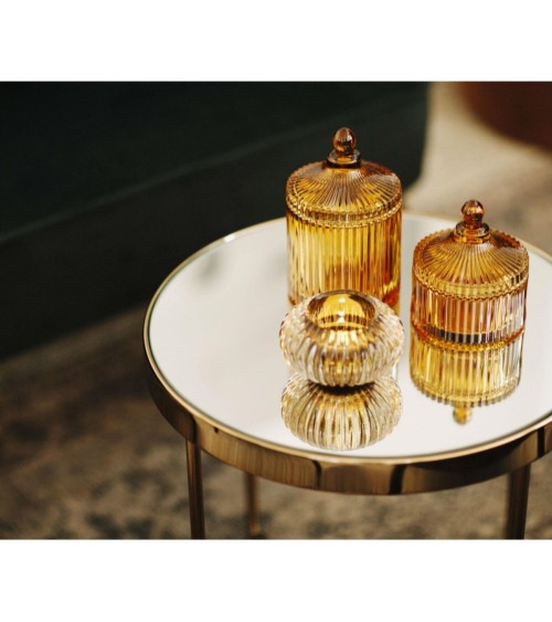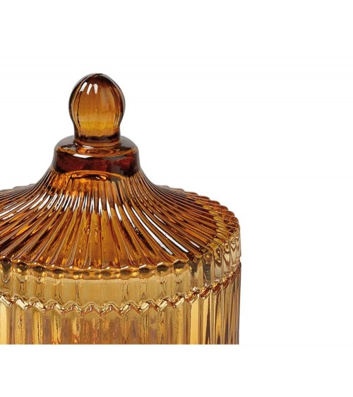 Boîte de rangement pour salle de bain en verre élégante et pratique.Dimensions: diamètre 10.5cm x Hauteur 12cmCouleur: AmbreMatière: Verre