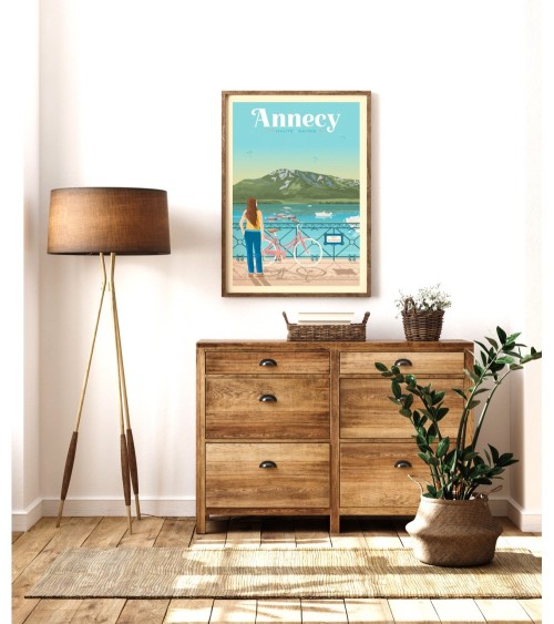 Une affiche de voyage au style vintage d'Annecy son lac et son pont des amoureux en France. Ce poster au design rétro et coloré trouvera sa place dans la décoration intérieure de votre maison, dans une chambre denfant ou encore votre salon et salle de jeux. Produit illustré, imprimé et conditionné en France.