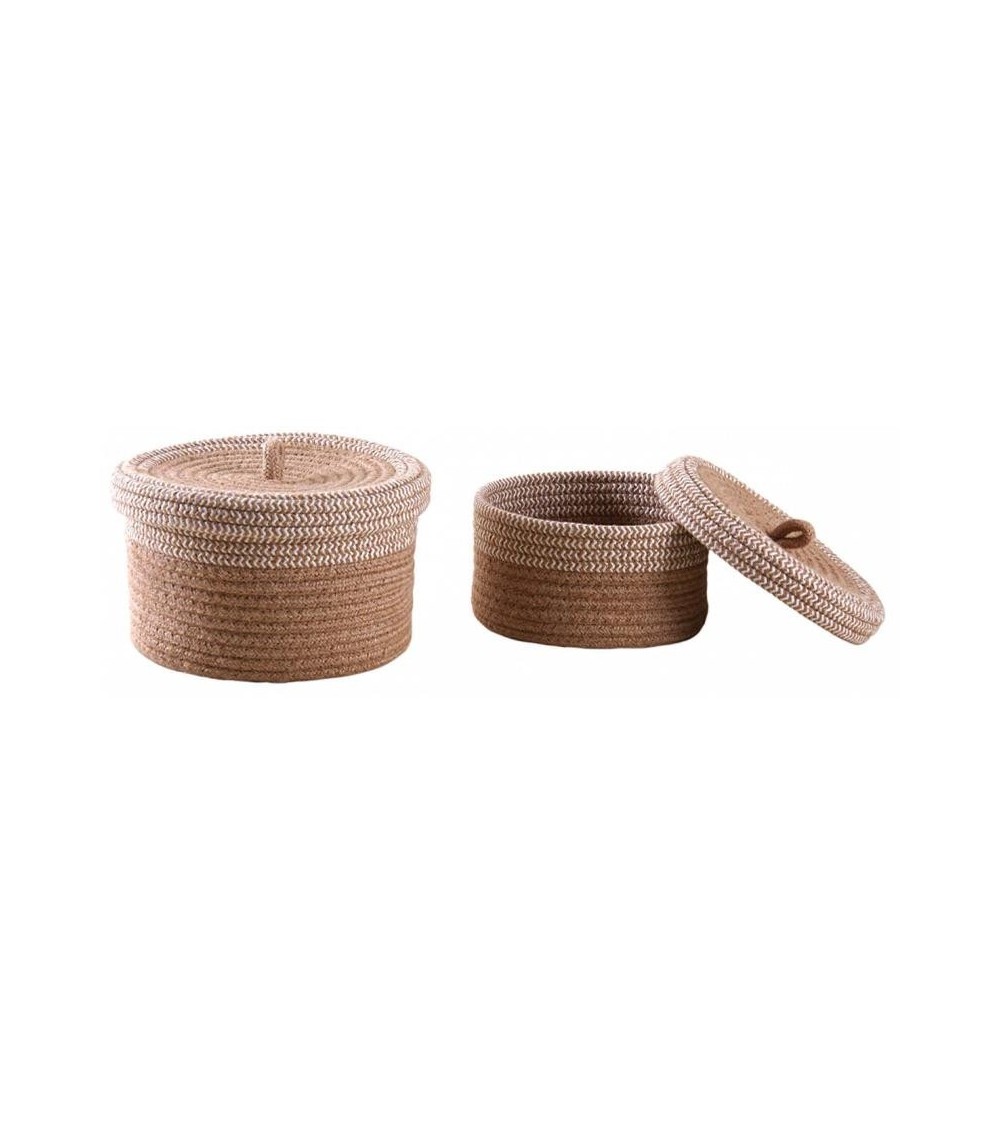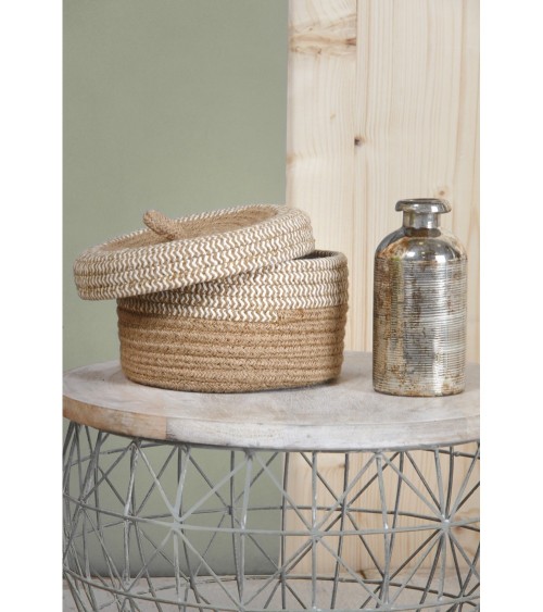 Aspect : Matériau principal : Jute naturelleDimensions : Dimensions du grand modèle : 23x15 cm (DxH)Dimensions du petit modèle : 20x11 cm (DxH)Autres caractéristiques : Composition : Lot de 2 boites de tailles différentesPoids (en kg) : 0,67 Boite en jute naturelle et blanche (Lot de 2)