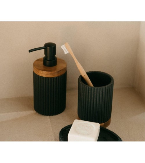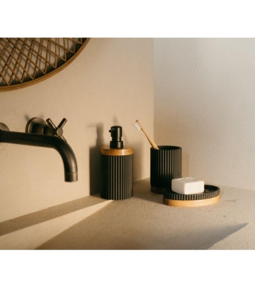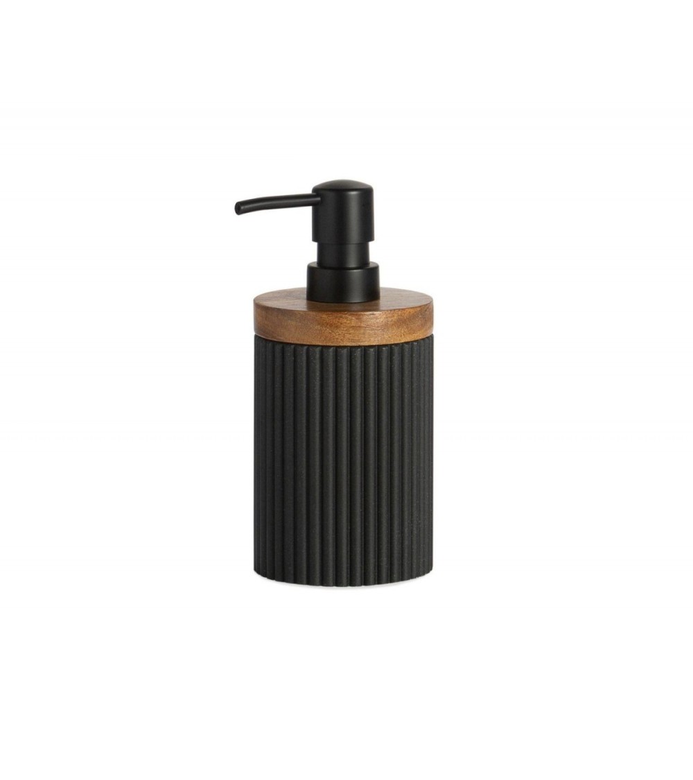 Distributeur de savon résine noir et bois d'acacia, à assortir avec les autres éléments pour salle de bain. Couleur: noir et bois Matière: Résine et bois d'acaciaDimensions: 8x8x18cm