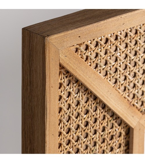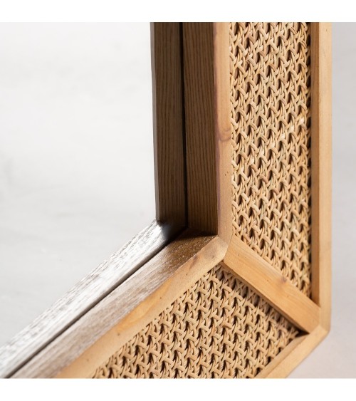 La collection Zetel associe la chaleur du bois avec la personnalité du métal, un tandem exquis qui évoque à la fois lélégance et le naturel. Le miroir de la collection est constitué dun cadre en rotin associé au bois . C'est un meuble dinspiration contemporaine, idéal pour les pièces les plus accueillantes. Sa taille est de 60x4x80 cm.