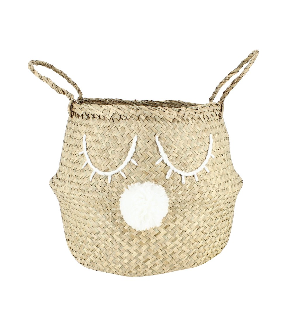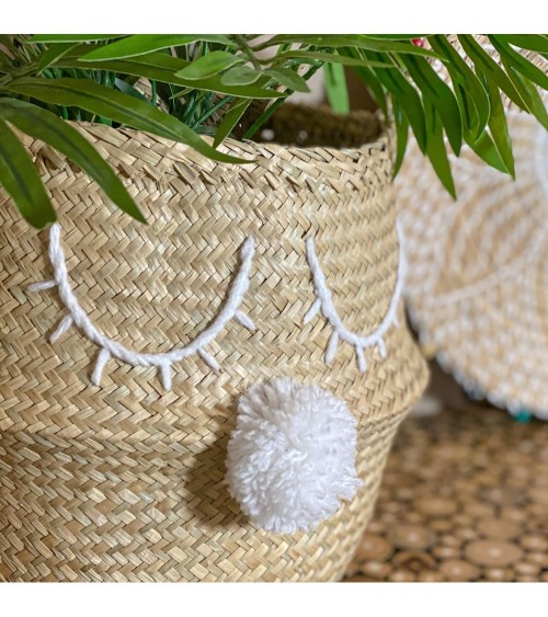 On craque pour ce joli panier NAXOS en jonc de mer tressé à la main. Avec son visage brodé et son pompon, il sera parfait dans la chambre de votre enfant, il lui permettra de ranger ses jouets et ses peluches. Magnifique objet de décoration qui peut-être utilisé également comme cache pôt qui s'inscrit dans la tendance actuelle. Panier cache pot en jonc de mer avec pompon. Dimension : Ø26cm X H26cm Poids : 0.200 kgs Utiliser un chiffon humide