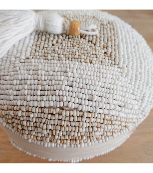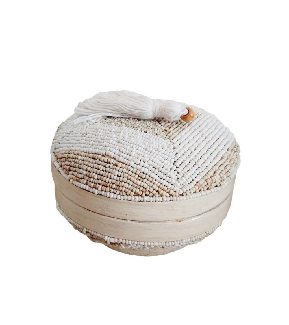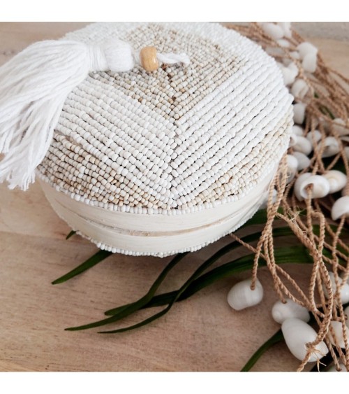 Nos boîtes uniques en bambou et perles de verre sont réalisées à la main par des artisans balinais qualifiés selon des techniques traditionnelles. Elles sont fabriquées à partir de bambou biologique, perles de verre et ornées d'un magnifique pompon et sont parfaites pour ranger de petits objets, des bijoux ou simplement pour décorer votre maison. Couleur - beige, blanc. Matière - bambou tressé, perles de verre. Diamètre 14 cm. Hauteur 10 cm