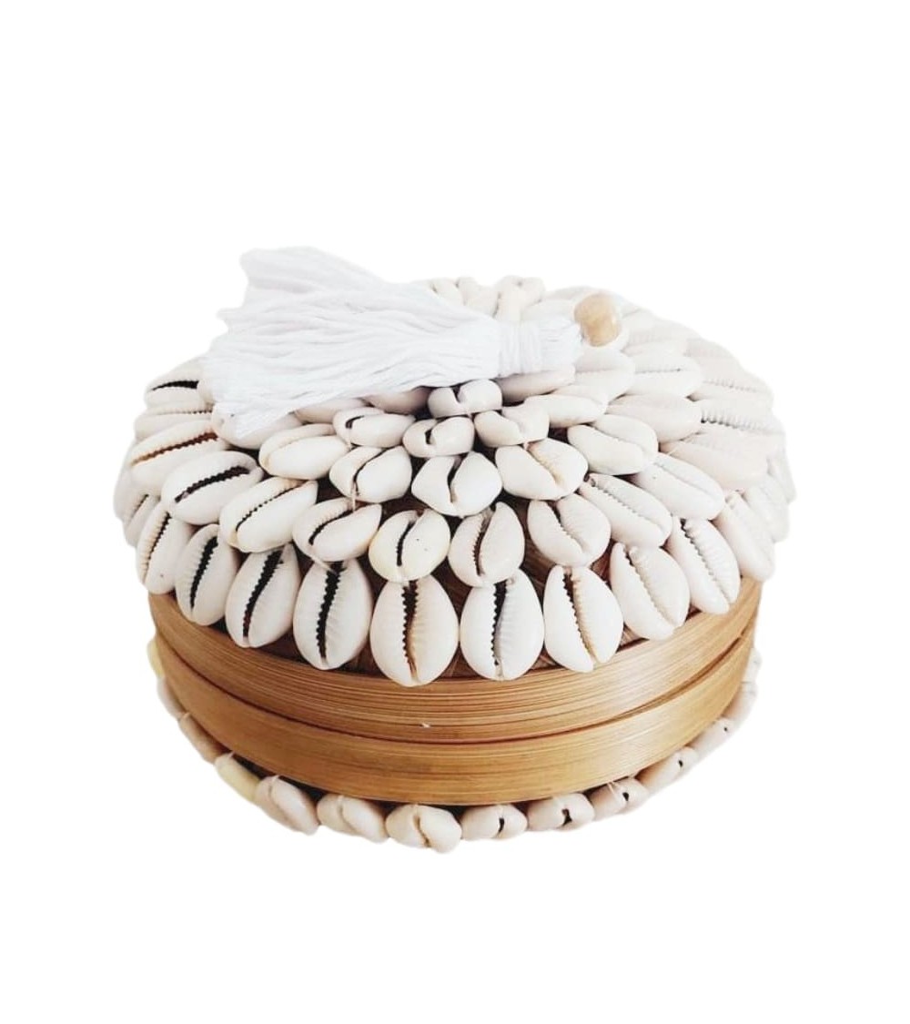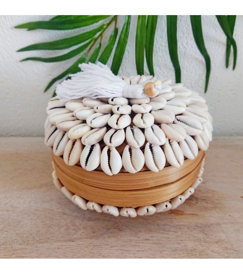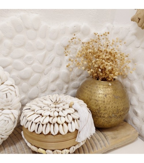 Boîte ronde en bambou tressé. De couleur naturelle, elle est ornée de coquillages cauris. Particulièrement décorative, elle sera parfaite pour y ranger des bijoux ou de petits objets. Couleur - naturel. Matière - bambou tressé, coquillages. Diamètre 14 cm; Hauteur 10 cm