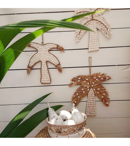 La décoration murale ''Palma'' est un beau produit fait à la main par les artisans balinais qui convient à n'importe quel endroit de la maison, en lui apportant lesprit ethnique et bohème, on peut l'accrocher sur un mur ou poser sur une commode. Elle est ornée de coquillages cauris, de fil de coton et de fil de jute. Article léger et facile à accrocher. Couleur : blanc, naturel. Matière : coquillages, fil de coton, fil de jute. Taille : H36 cm x L26 cm