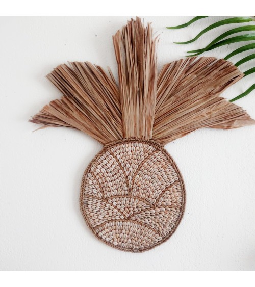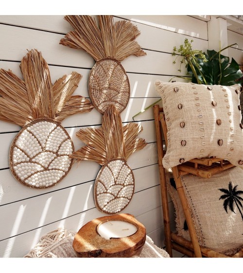 Excellent objet de décoration pour créer une ambiance des îles tropicales. Nos ananas sont réalisés à la main de coquillages cauris et de raphia. On peut les accrocher au mur ou poser sur une table ou une commode. Couleur : beige naturel. Matière : coquillages cauris, raphia. Taille : H55 cm x L55 cm
