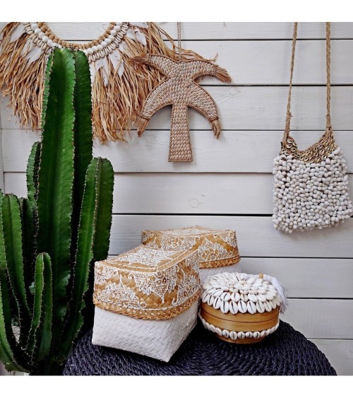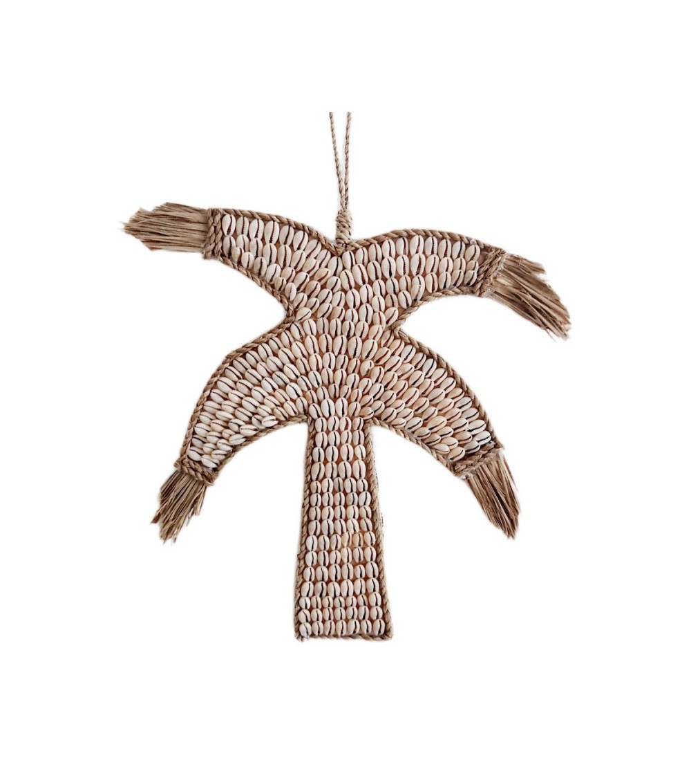 La décoration murale ''Palma'' est un beau produit fait à la main par les artisans balinais qui convient à n'importe quel endroit de la maison, en lui apportant lesprit ethnique et bohème, on peut l'accrocher sur un mur ou poser sur une commode. Elle est ornée de coquillages cauris et de raphia. Article léger et facile à accrocher. Couleur : beige, naturel. Matière : coquillages cauris, raphia. Taille : H36 cm x L26 cm