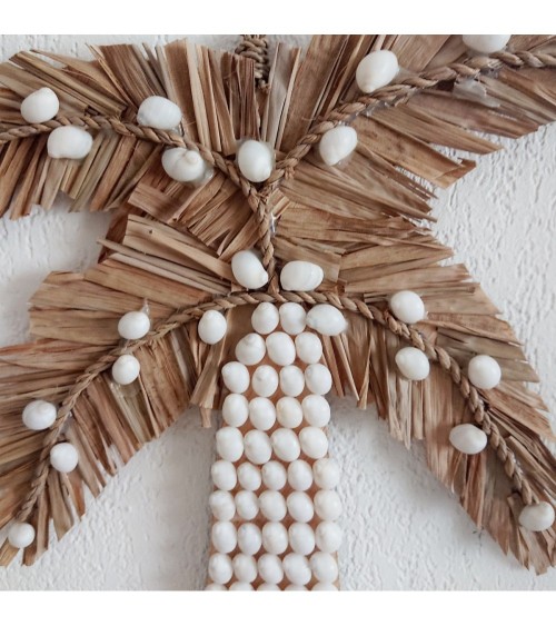 La décoration murale ''Palma'' est un beau produit fait à la main par les artisans balinais qui convient à n'importe quel endroit de la maison, en lui apportant lesprit ethnique et bohème, on peut l'accrocher sur un mur ou poser sur une commode. Elle est ornée de coquillages cauris, de fil de coton et de fil de jute. Article léger et facile à accrocher.Couleur : blanc. Matière : coquillages blancs, raphia, fil de jute. Taille : H36 cm x L26 cm